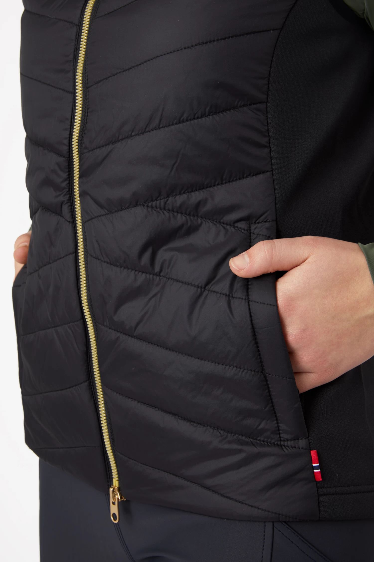This elegant lightweight padded vest creates a beautiful feminine silhouette thanks to the stretchy waistbelt at the back. With the elegant gold details, like buttons, two-way zipper and logo on the back neck this vest is truly a must-have for the classy stable look. The zipper pockets keep small objects safely tucked away. The buttons at the back open riding slits for increased freedom of movement in the saddle.