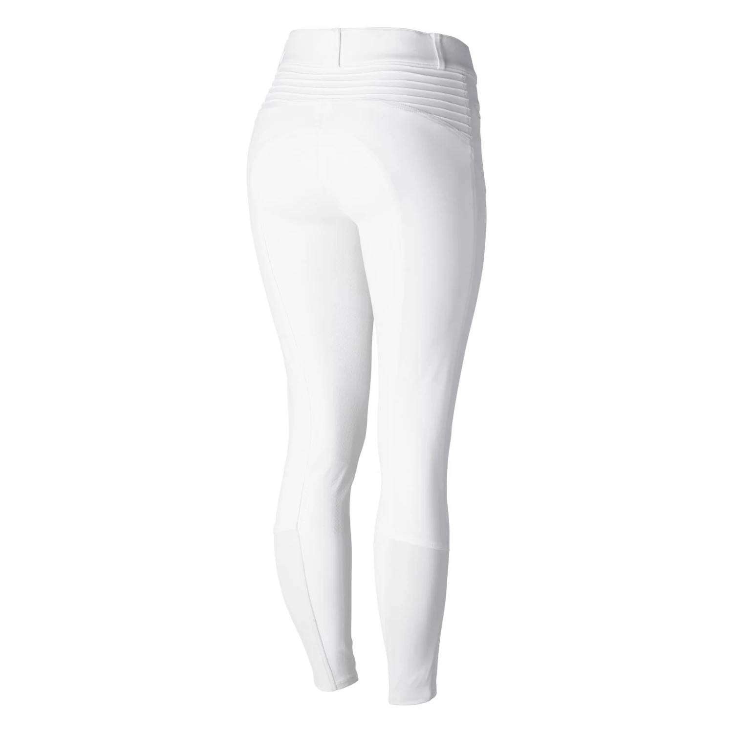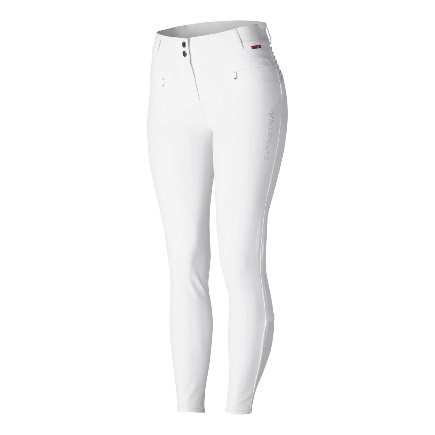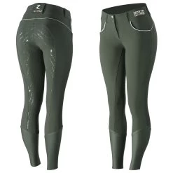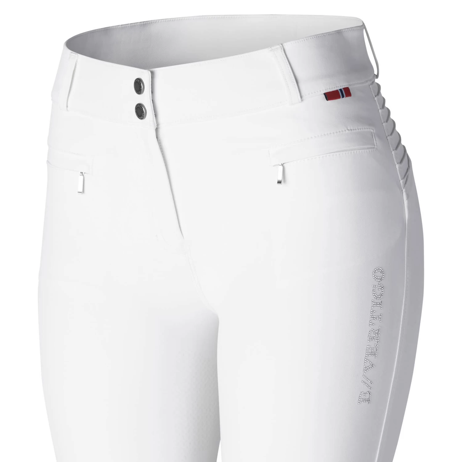 The new B Vertigo Drea breeches make a classic statement. Their great fit with the mid to high waist makes them super flattering. The pleat detail on the back creates a special elegance. The silicone full seat ensures movability in the saddle. A sparkly crystal logo on the thigh completes the look.