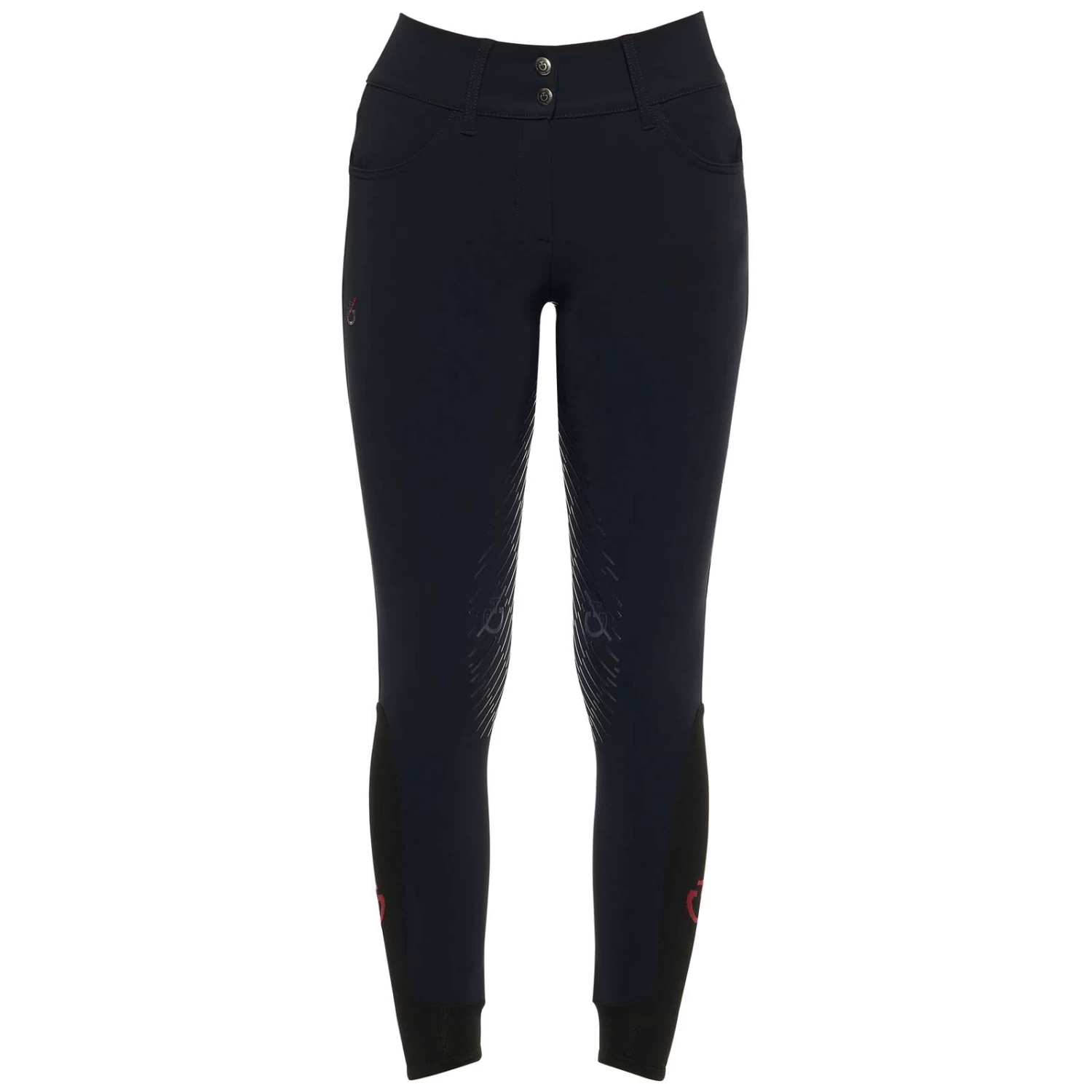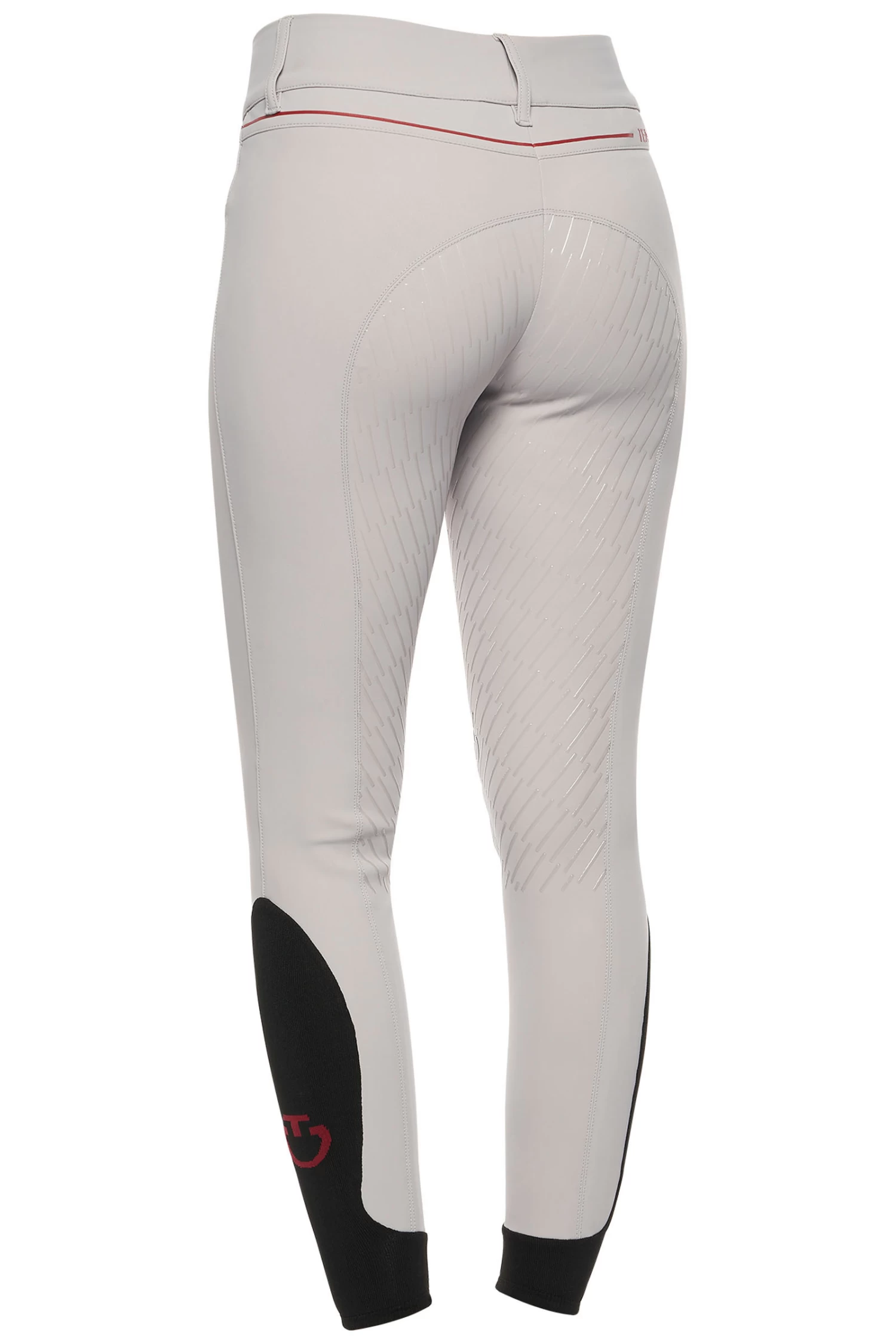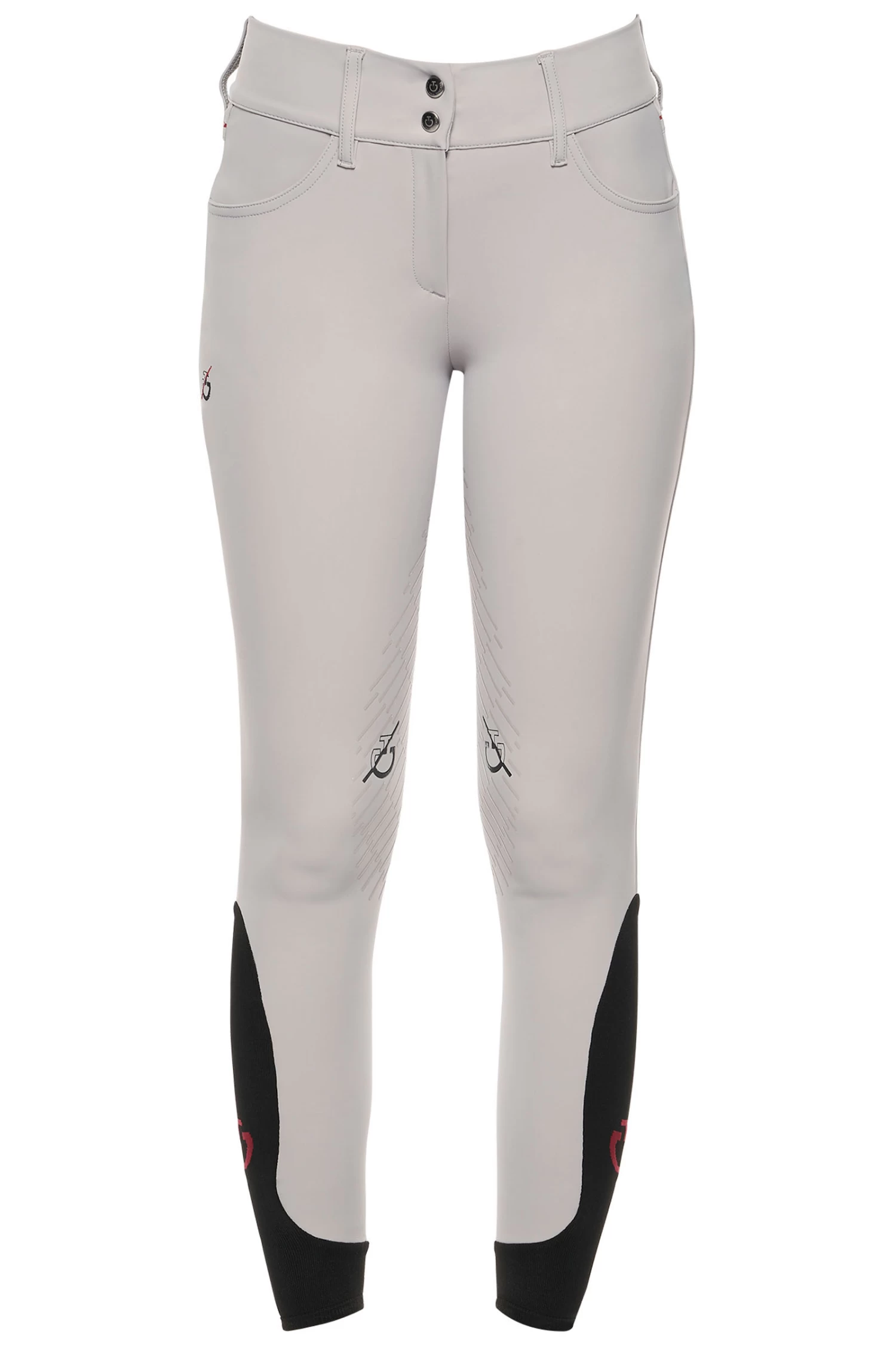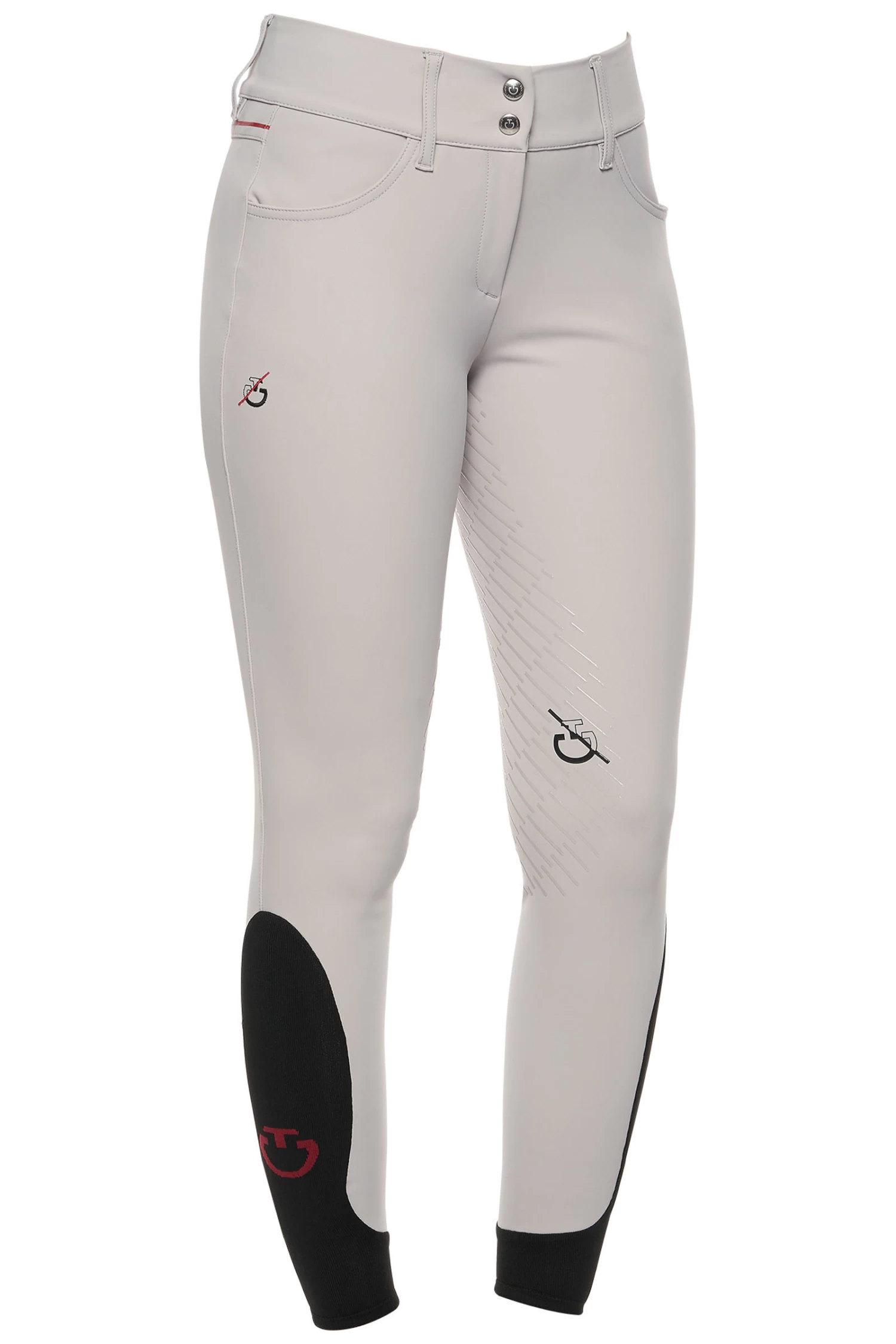 The women’s riding breeches are made from 4-way stretch jersey. The technical material provides high breathability and freedom of movement: this fabric adheres perfectly to your body, without constriction. The transparent knee grip allows the right stability on the horse, while the stretch-knit socks improve the fit beneath your boots. It features two front pockets and a zip up front with botton. CT Team customisation.