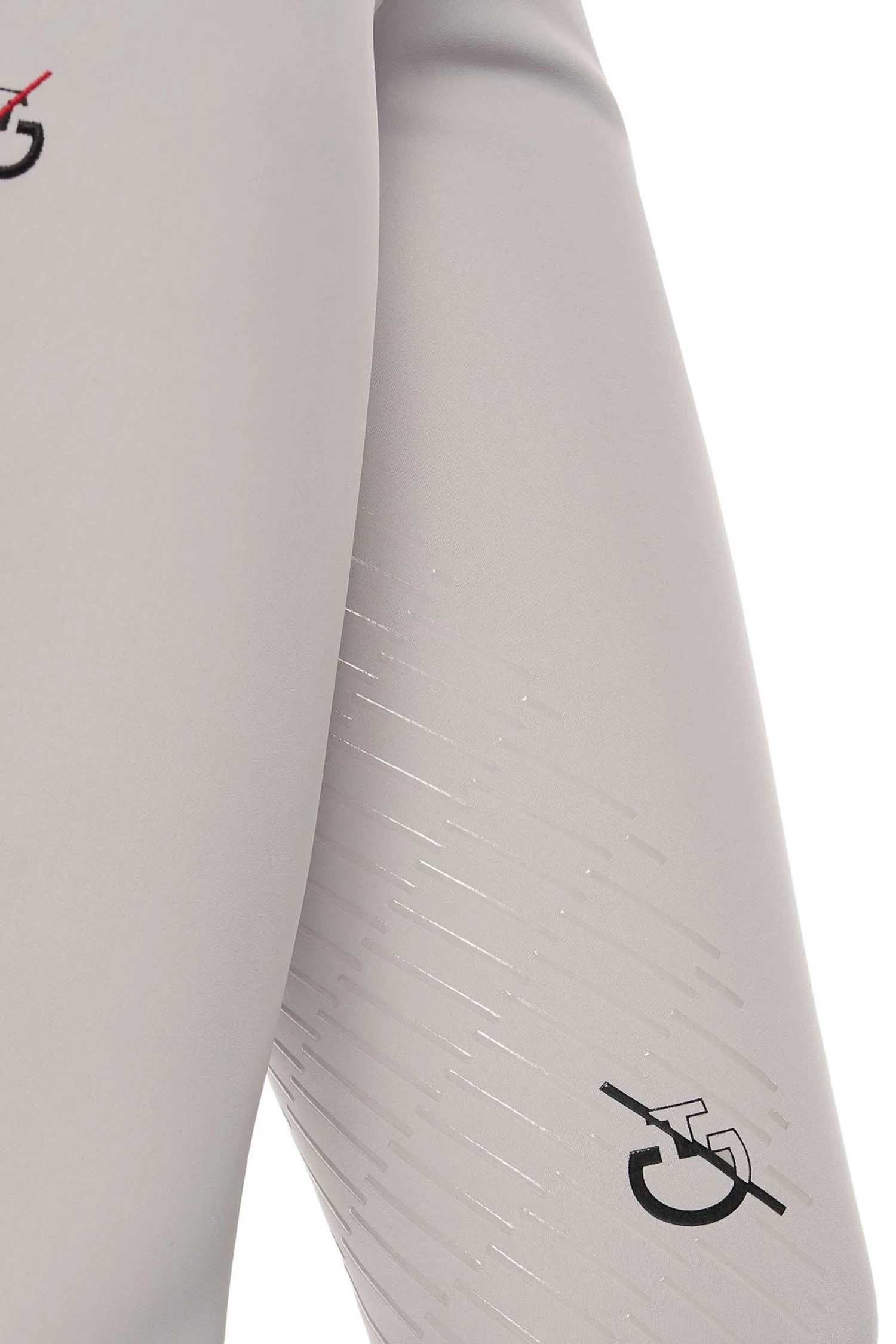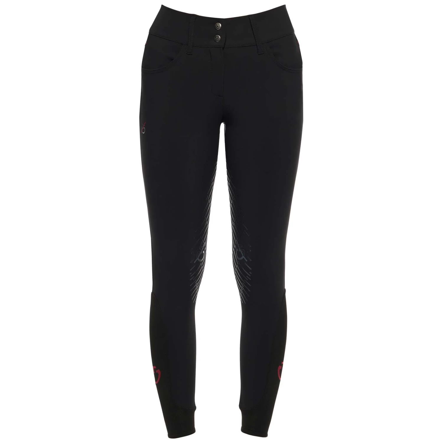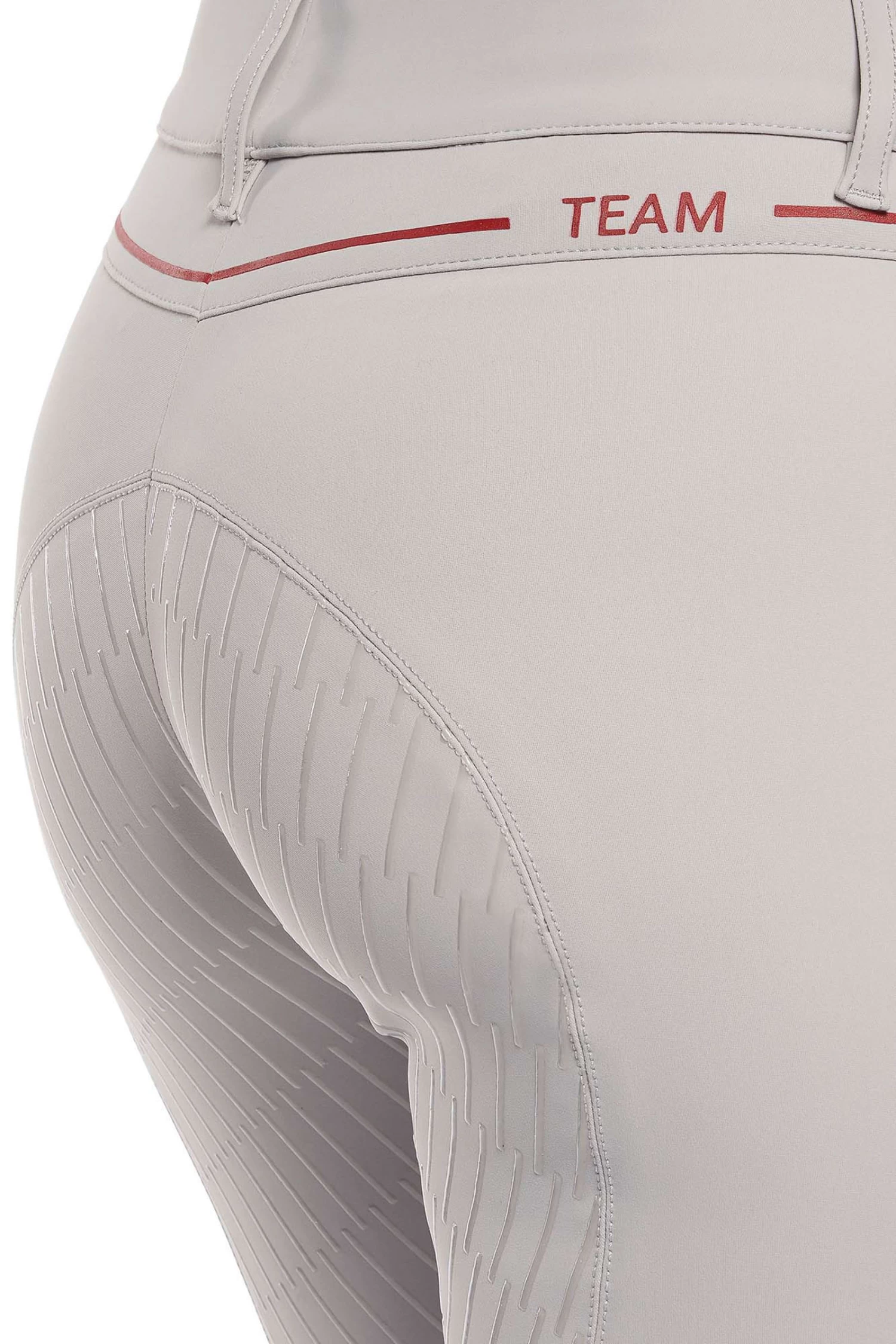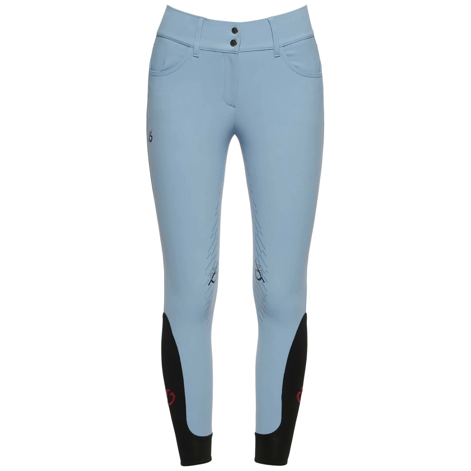 The women’s riding breeches are made from 4-way stretch jersey. The technical material provides high breathability and freedom of movement: this fabric adheres perfectly to your body, without constriction. The transparent knee grip allows the right stability on the horse, while the stretch-knit socks improve the fit beneath your boots. It features two front pockets and a zip up front with botton. CT Team customisation.