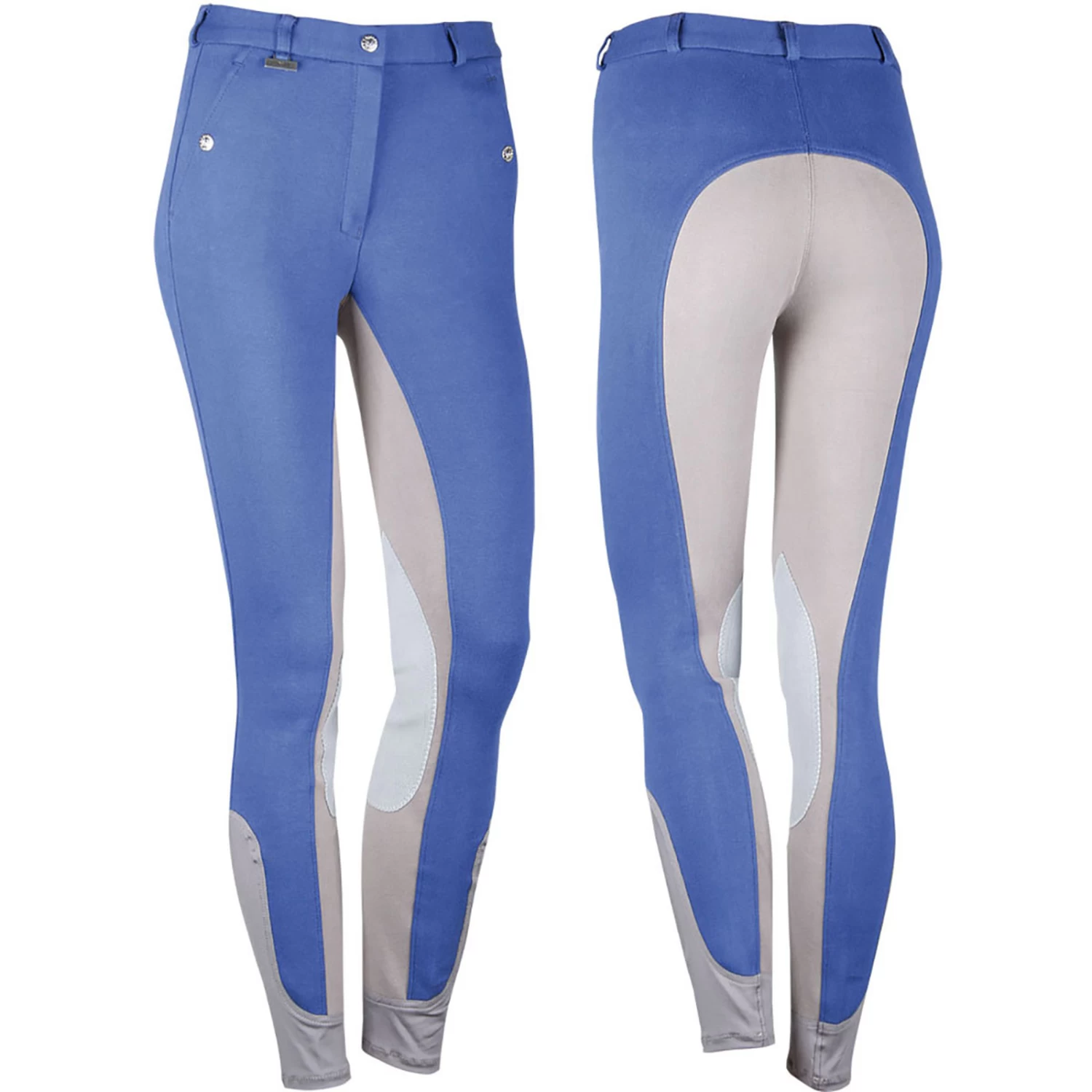 Riding breeches with slide closure, zipper, press-stud pockets, belt loops and lycra Flex legs.