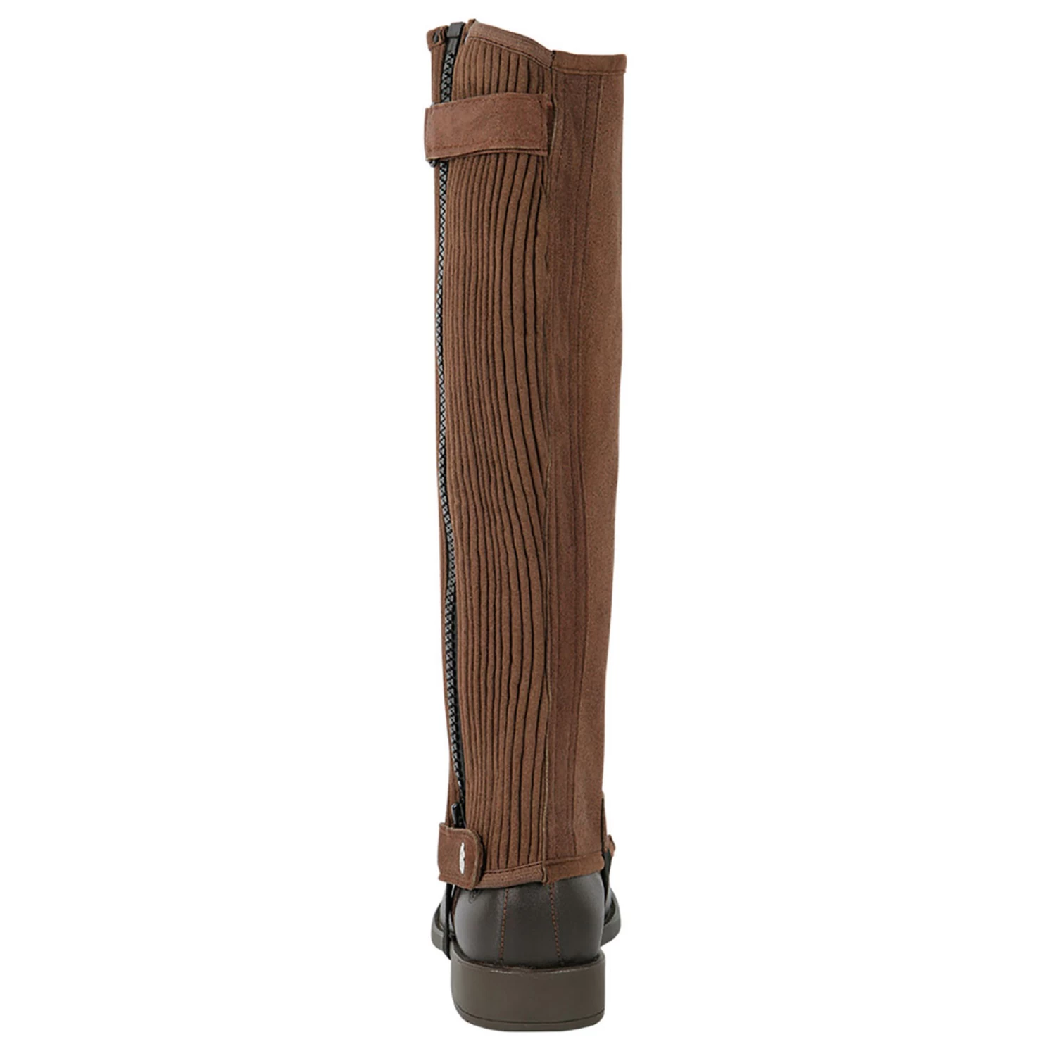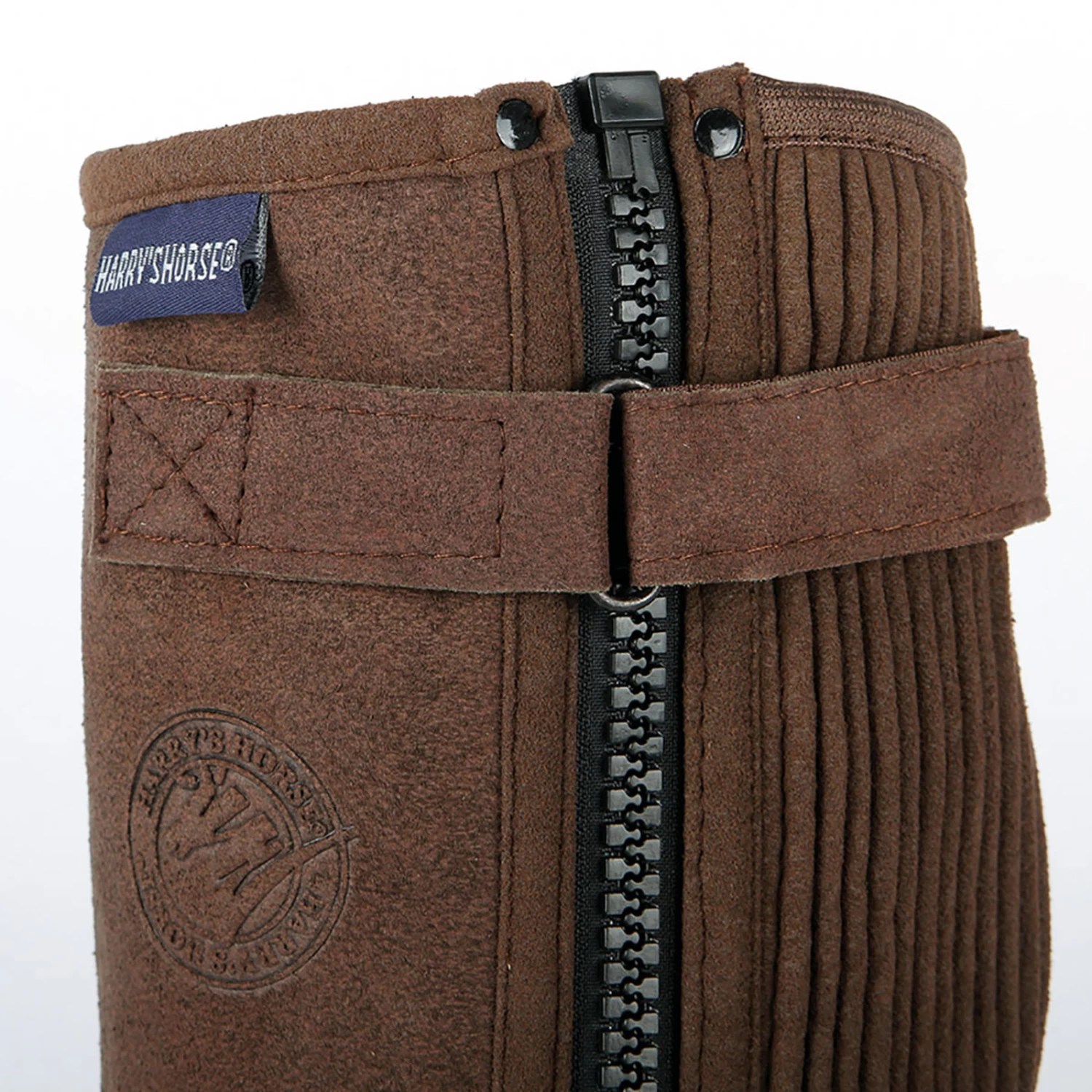 Amara minichap with elastic calf area and zipper on the outside. Amara is a synthetic suede which is fully washable at 30 degrees on normal program. Absolutely not for in the dryer.