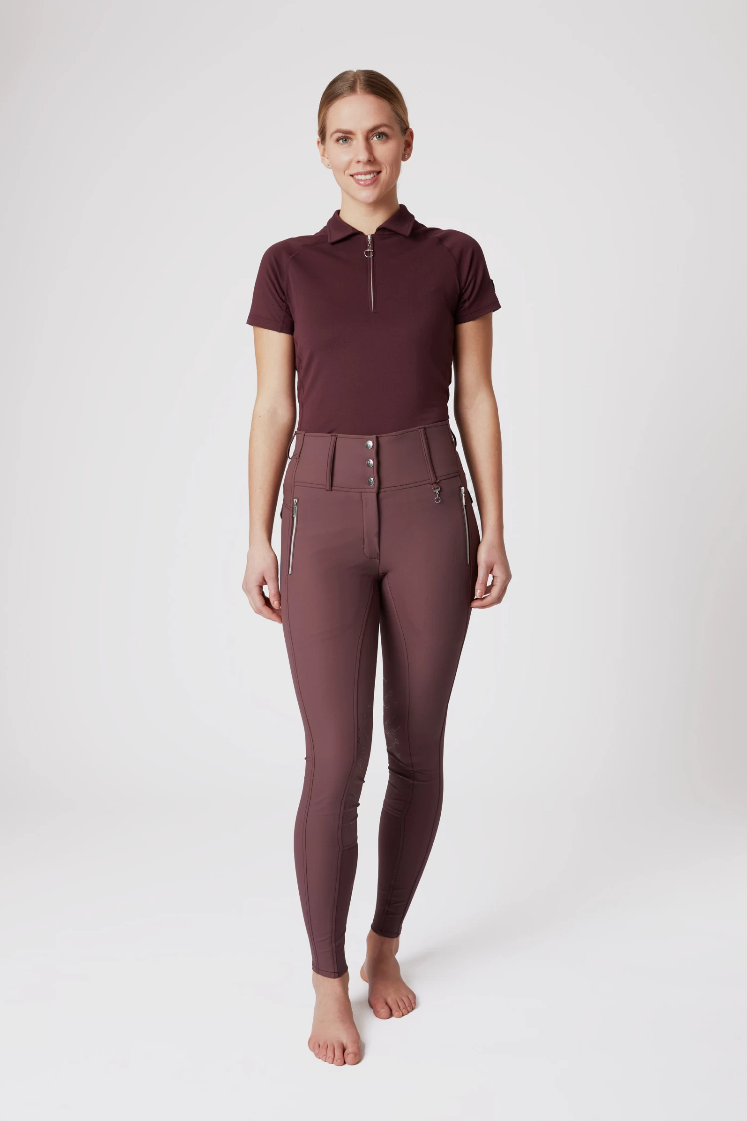 The Horze Andrea breeches are decorated with flattering seams down the front that elongate your legs. The waistband with three buttons is higher in the front, adding a stylish detail. Two zipper pockets offer space for your belongings, and the silicone knee patch keeps you flexible in the saddle.