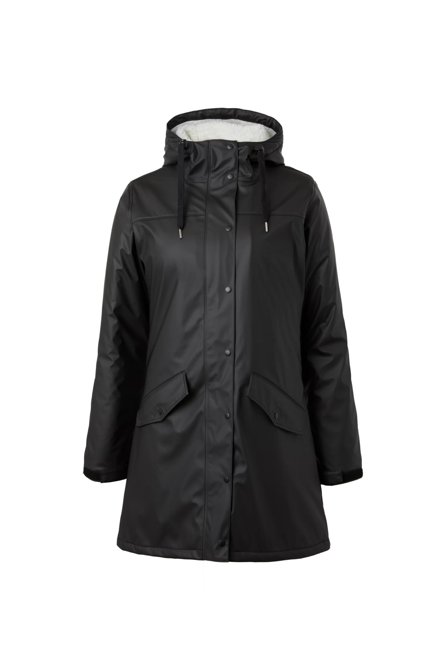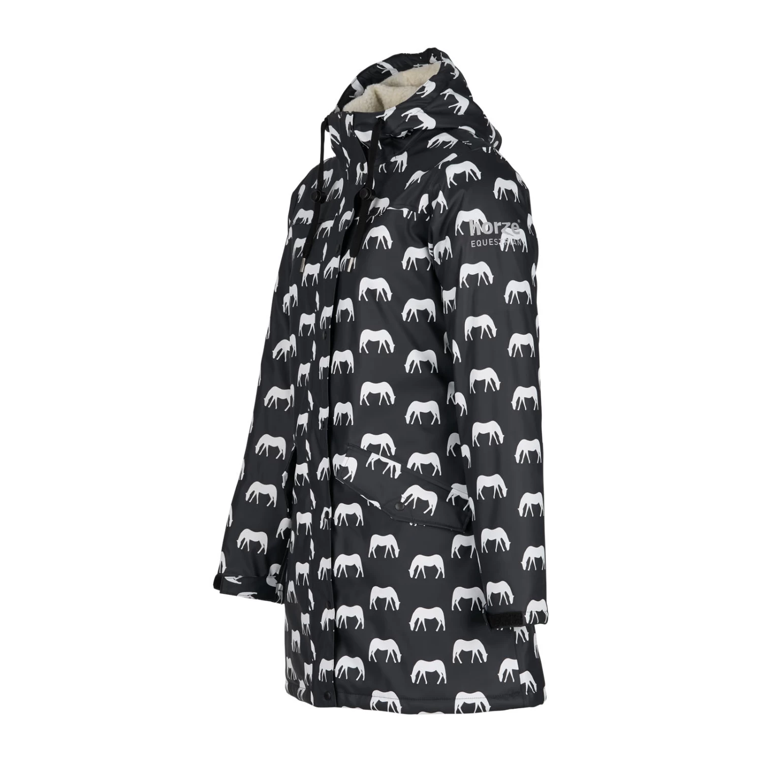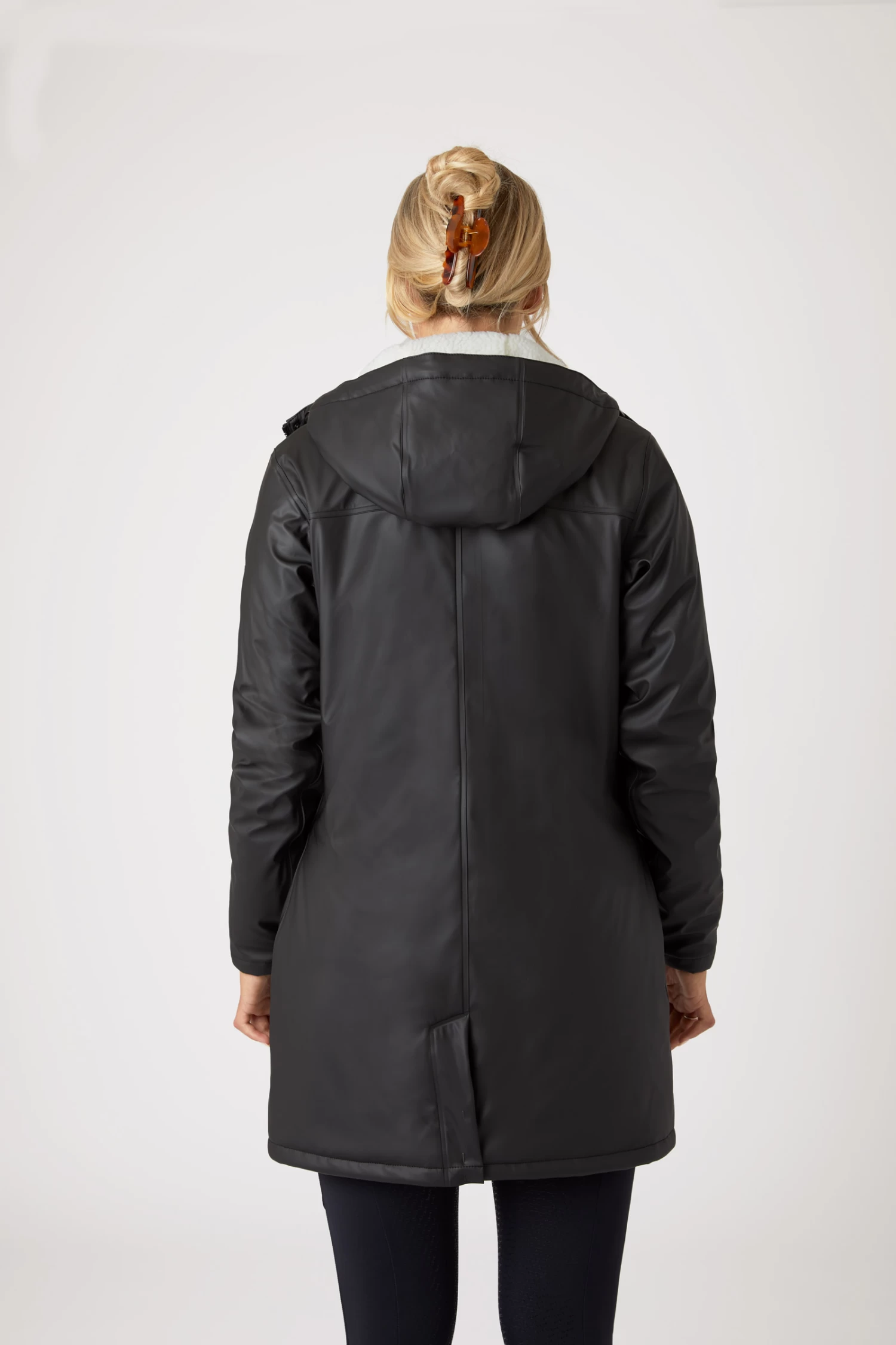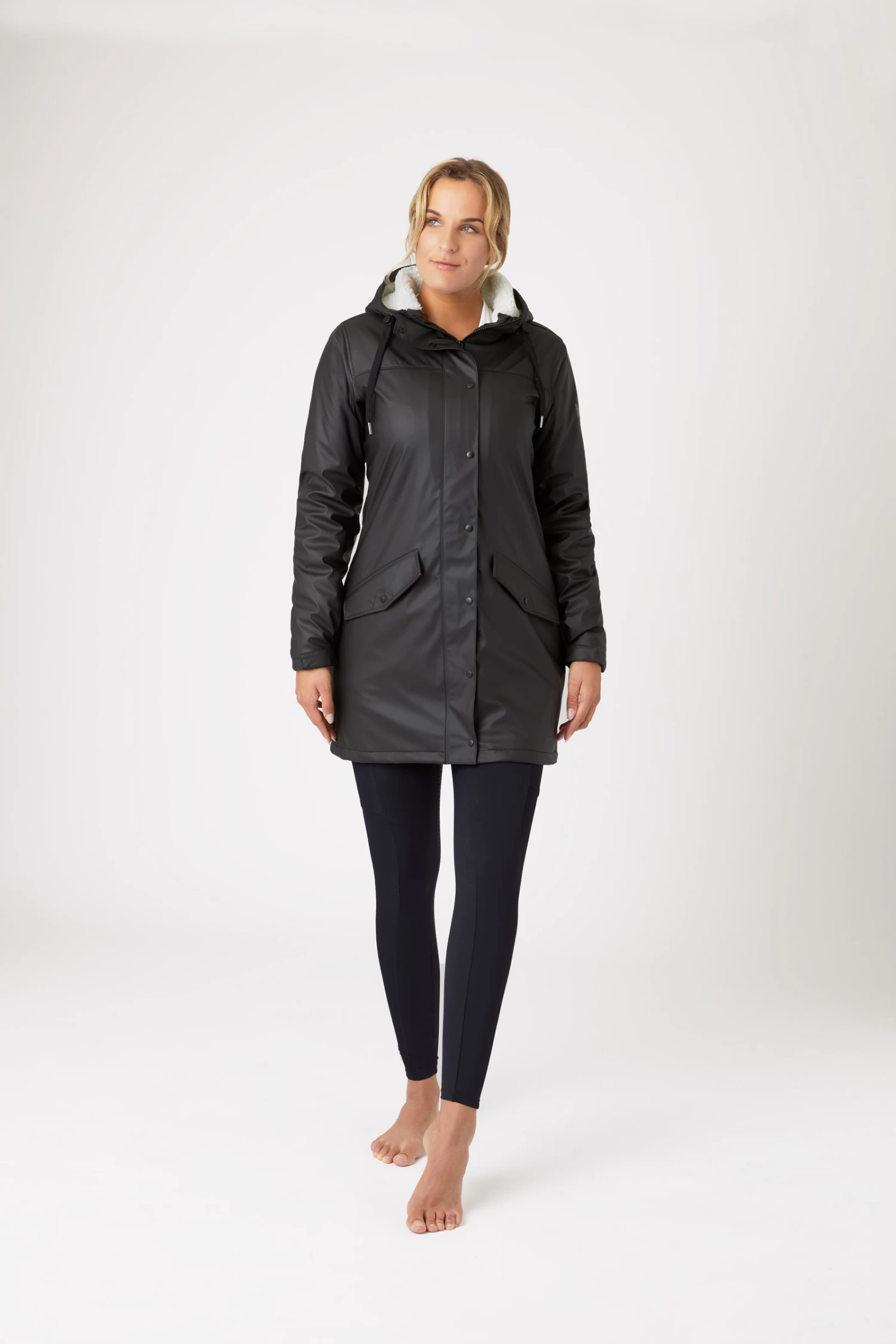 A drawstring hood keeps moisture away, and the fluffy teddy fleece lining helps you stay warm and dry when you wear this classic raincoat. The Horze Billie PU Rain Jacket is designed to protect you from the elements with adjustable cuffs, a 2-way zipper and press button front. The big pockets hold keys, treats and other treasures so you can wear this jacket around the stable or on horseback. The reflective print on the sleeve ads a touch of visibility on dark, dreary days. The longer length of this jacket ensures full coverage from the elements.