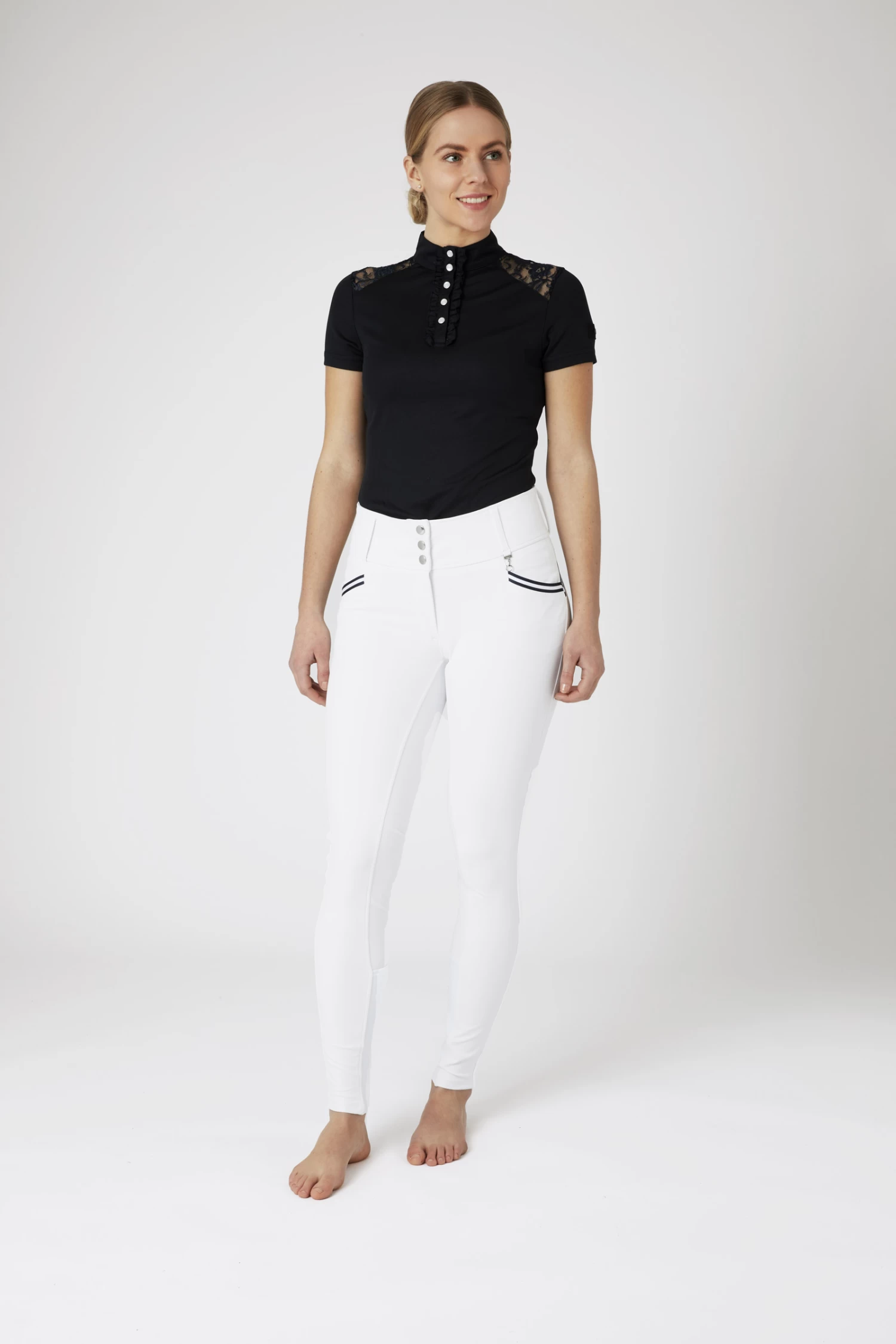 The Horze Della breeches are equipped with a high waist and designed in classic shape and colours. Contrast piping looks flattering, and the silicone knee patch provides flexibility the saddle. Also available with full seat (#36681).