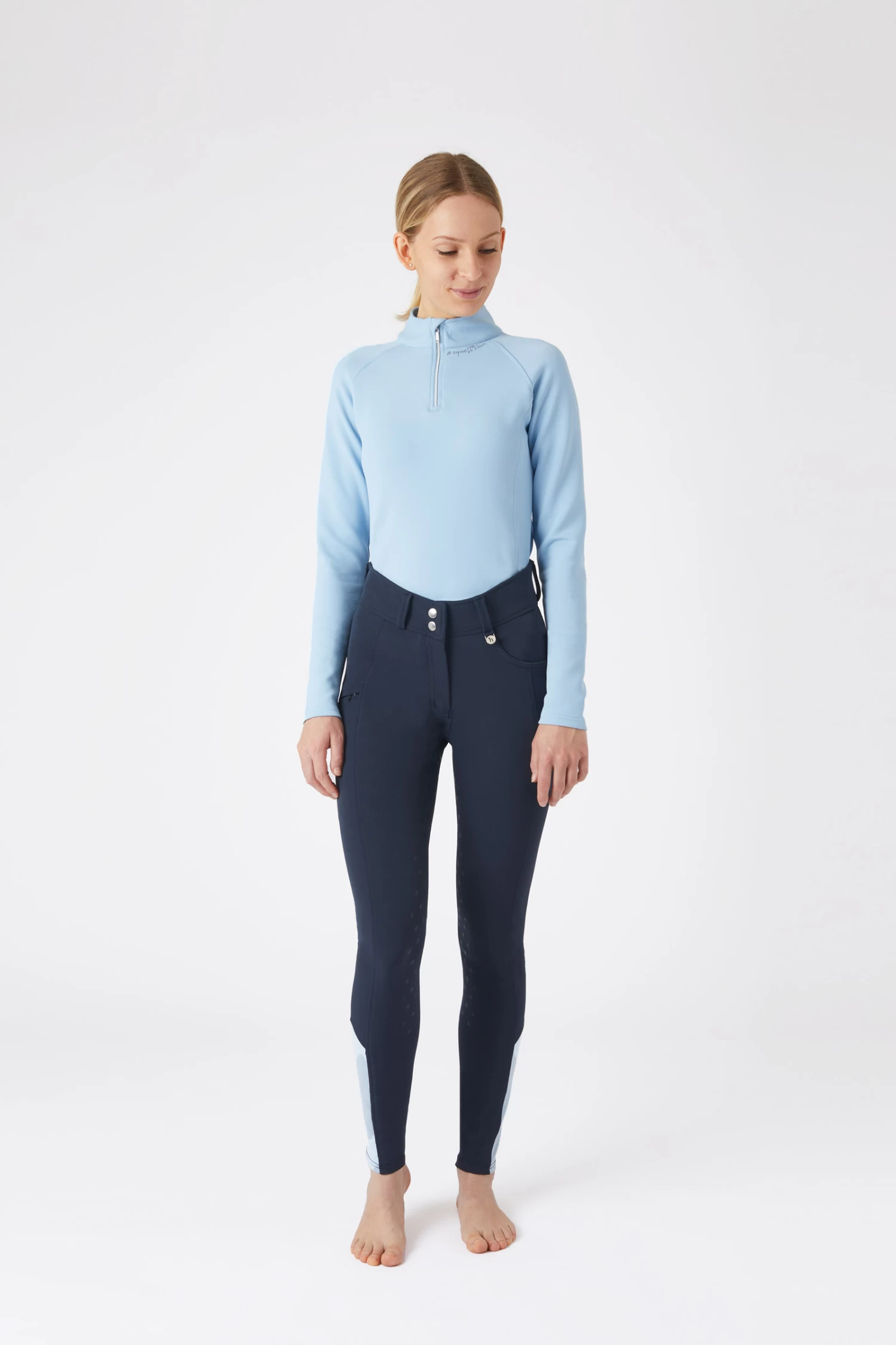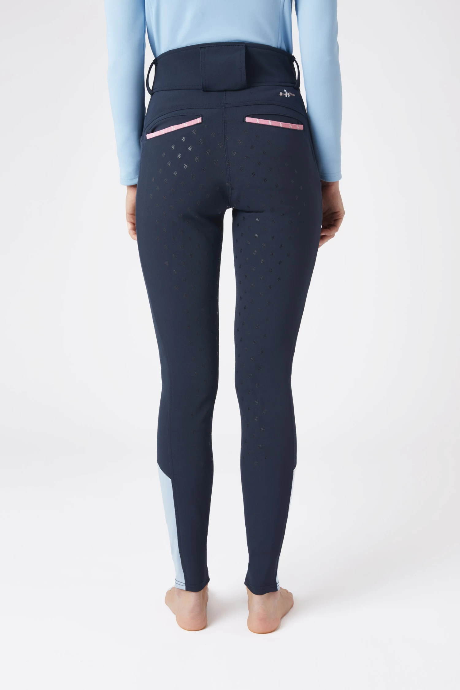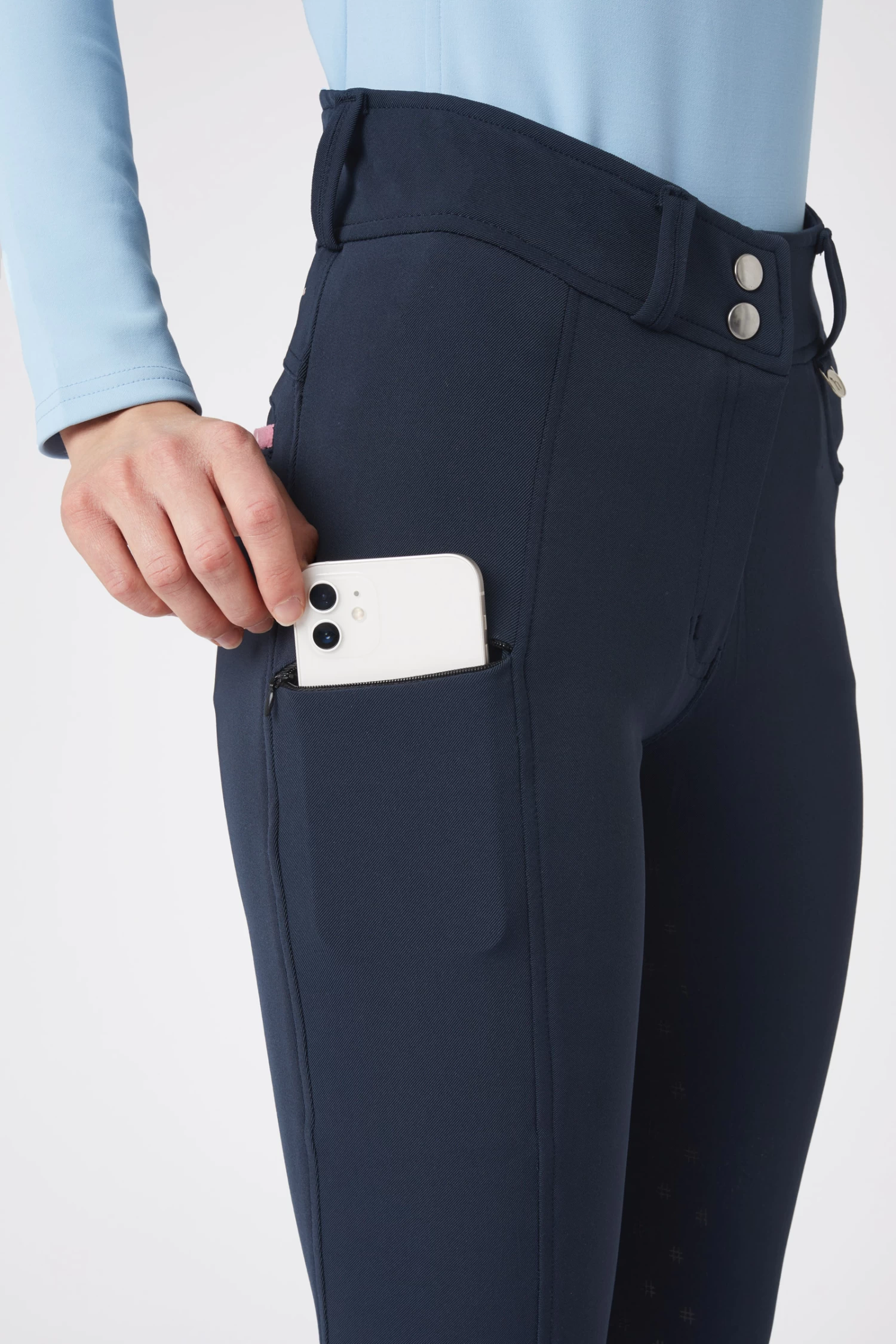 These breeches are designed to provide young riders with both comfort and performance. Made with compression material, they offer a supportive and flattering fit. The logo tape on the back pockets adds a touch of branding. The # silicon print on the seat ensures excellent grip and stability in the saddle. The contrast-colored leg bottoms add a trendy detail. With a convenient mobile phone pocket and one front pocket, young riders can keep their essentials close at hand. Available in young rider sizes, these breeches are tailored to fit perfectly.