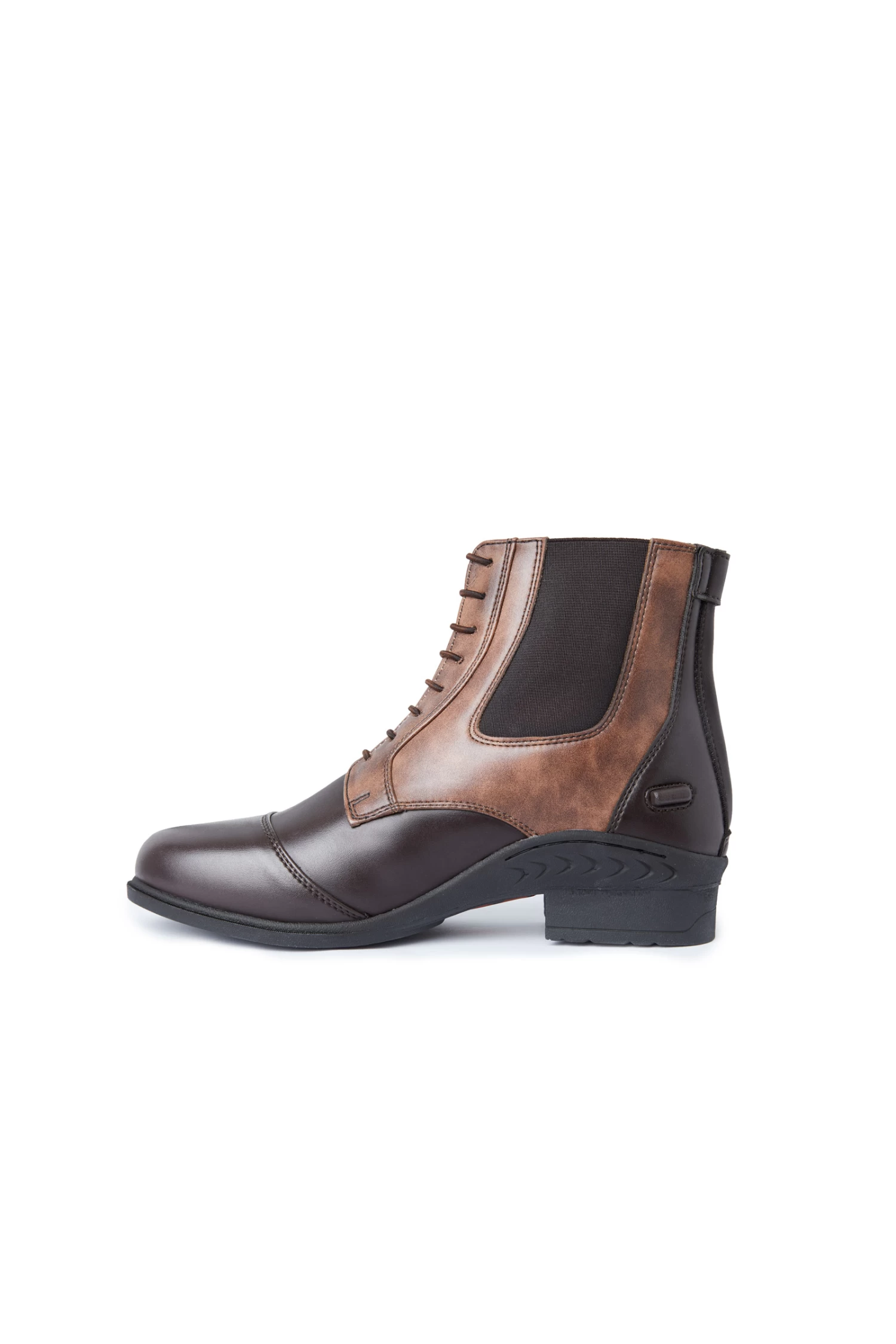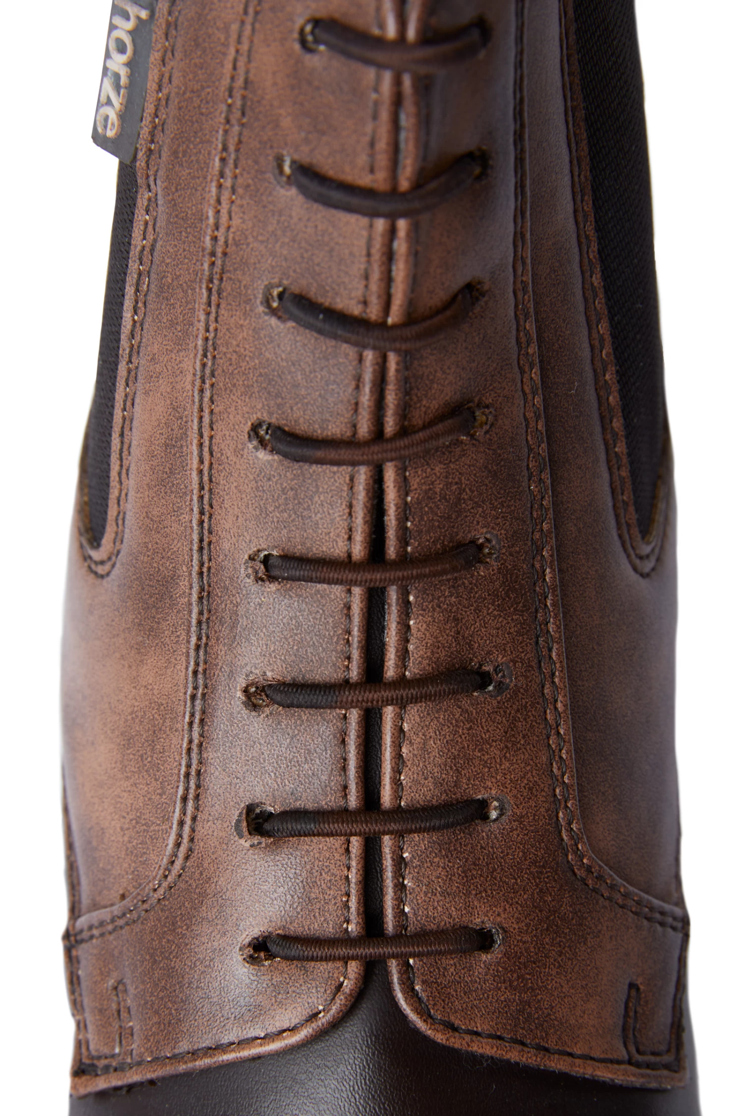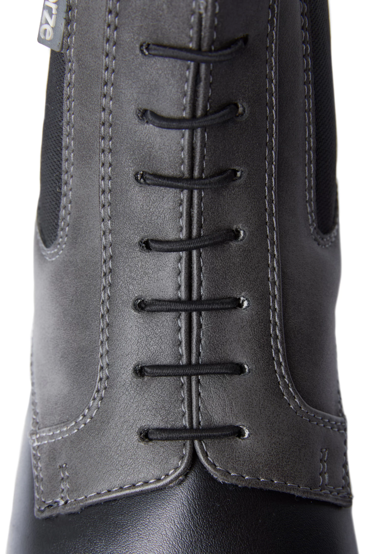 The Horze Kilkenny jodhpur boots will quickly become a staple in your riding wardrobe. They are made from two-toned synthetic leather that is comfortable and easy to clean. Back zipper and elastic sides offer quick access while elastic laces provide a classic look. The durable sole keeps you safe in stirrups and on wet grounds. Pair them with chaps for a riding boot look or wear them on their own.