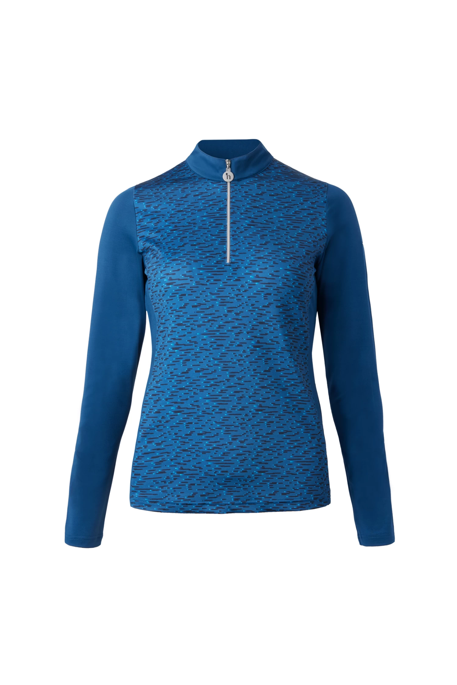 The Horze Livia Functional Shirt is a baselayer with half zip and slight mock neck, perfect for training sessions on autumn days or as layering piece. The allover print on the front panel in combination with the side seams creates a slimming form. A small branding on zipper puller & sleeve badge top off this timeless design.
