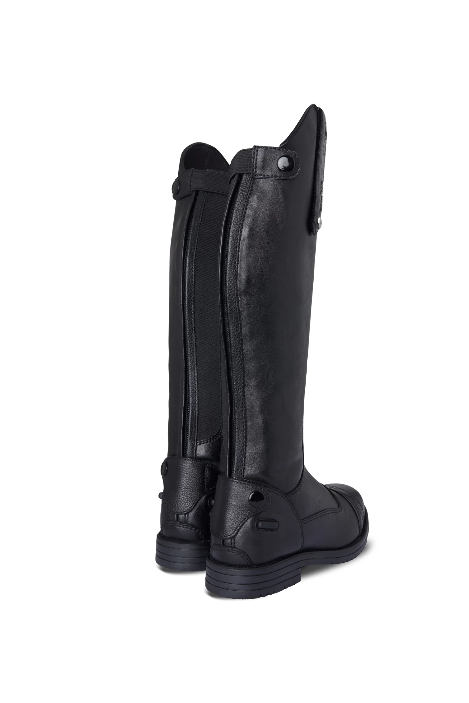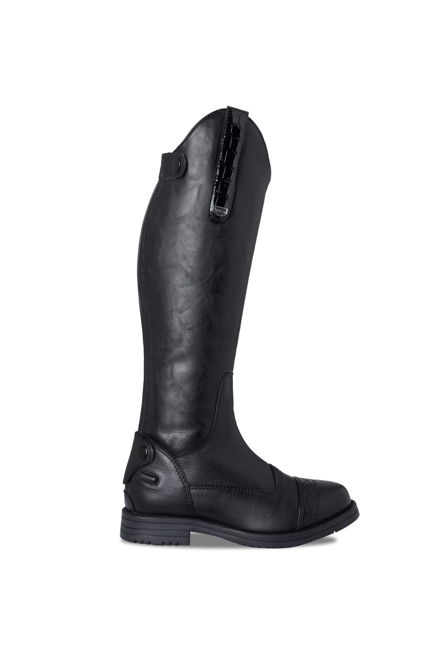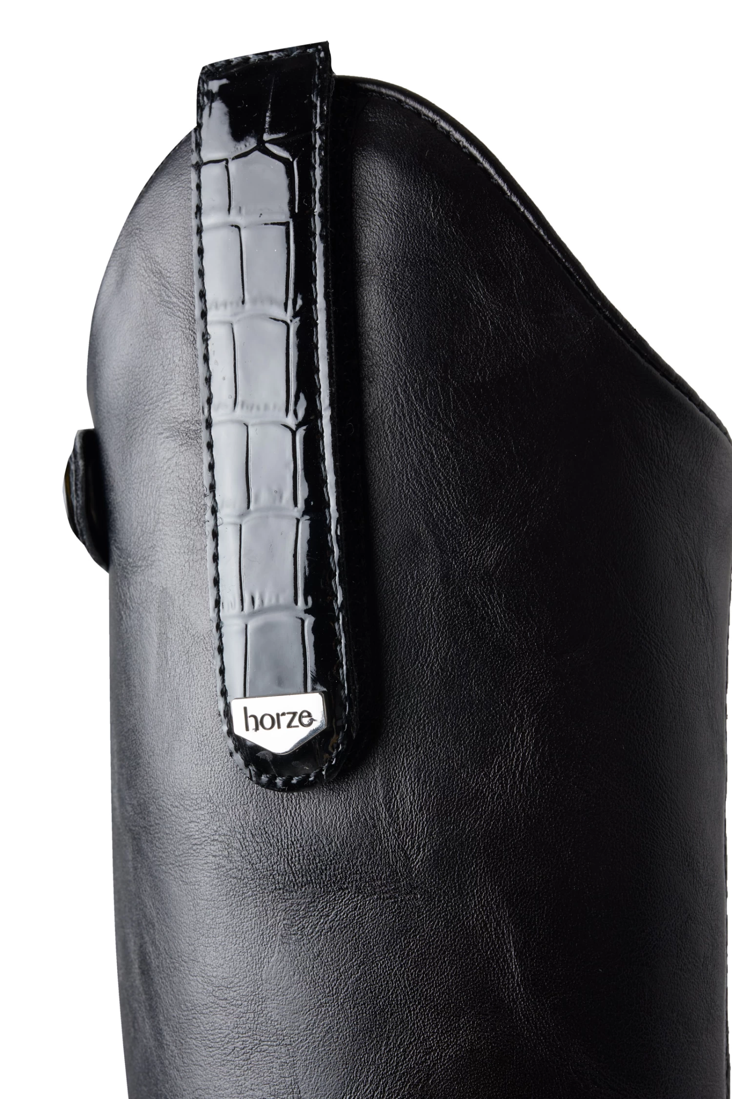 These vegan leather boots with exchangeable boot tab bring two different looks to your stable outfit. One plain & one faux croco version are included. Stitch decorations at the toe cap top of the elegant look. For a perfect fit the Sacramento Tall Boots feature an elastic insert along the back zipper.