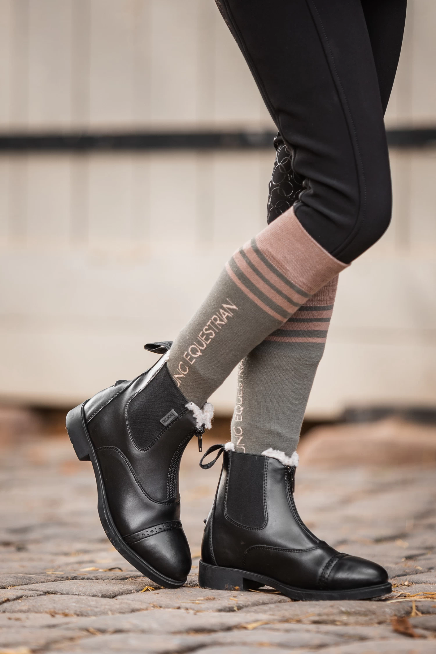 These jodhpur boots have the look and feel of traditional paddock boots but a quick front-zip means kids are ready to go in an instant. The reliable craftmanship combines quality and a classic style. The soft, synthetic leather-like material is easy to care for and always looks new. Faux fur lining keeps little riders’ feet warm. These boots are a great value for their everyday stable and riding needs, with a quality that will last.