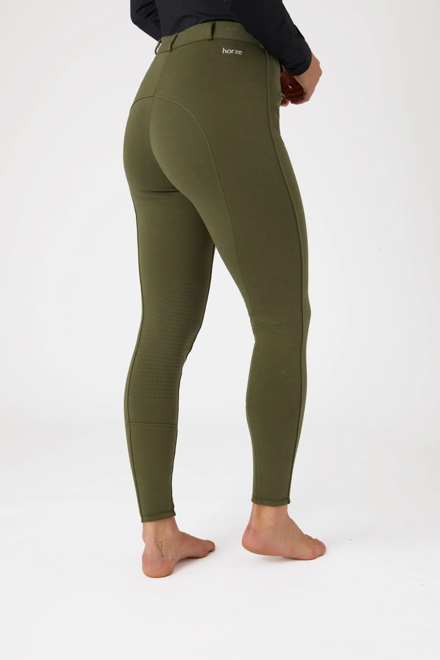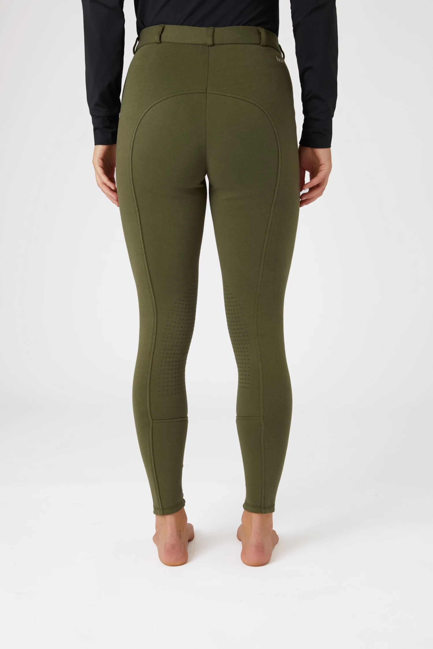 Jersey-feel fabric gives these schooling breeches soft comfort. They are a nice choice when you don�t want formal breeches. The soft fabric is warm and breathable and ideal for afternoon rides and stable days. The simple zipper pocket in the front will hold horse treats for rewarding a nice ride. You will love the comfort of these pretty breeches.