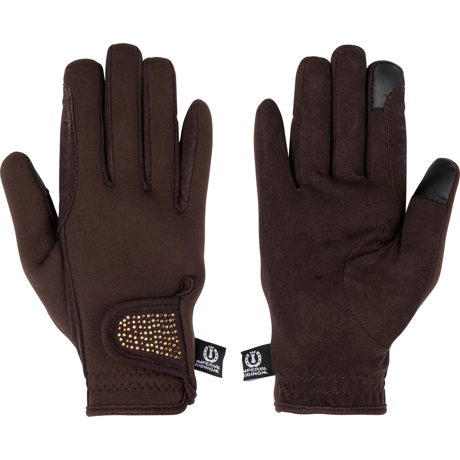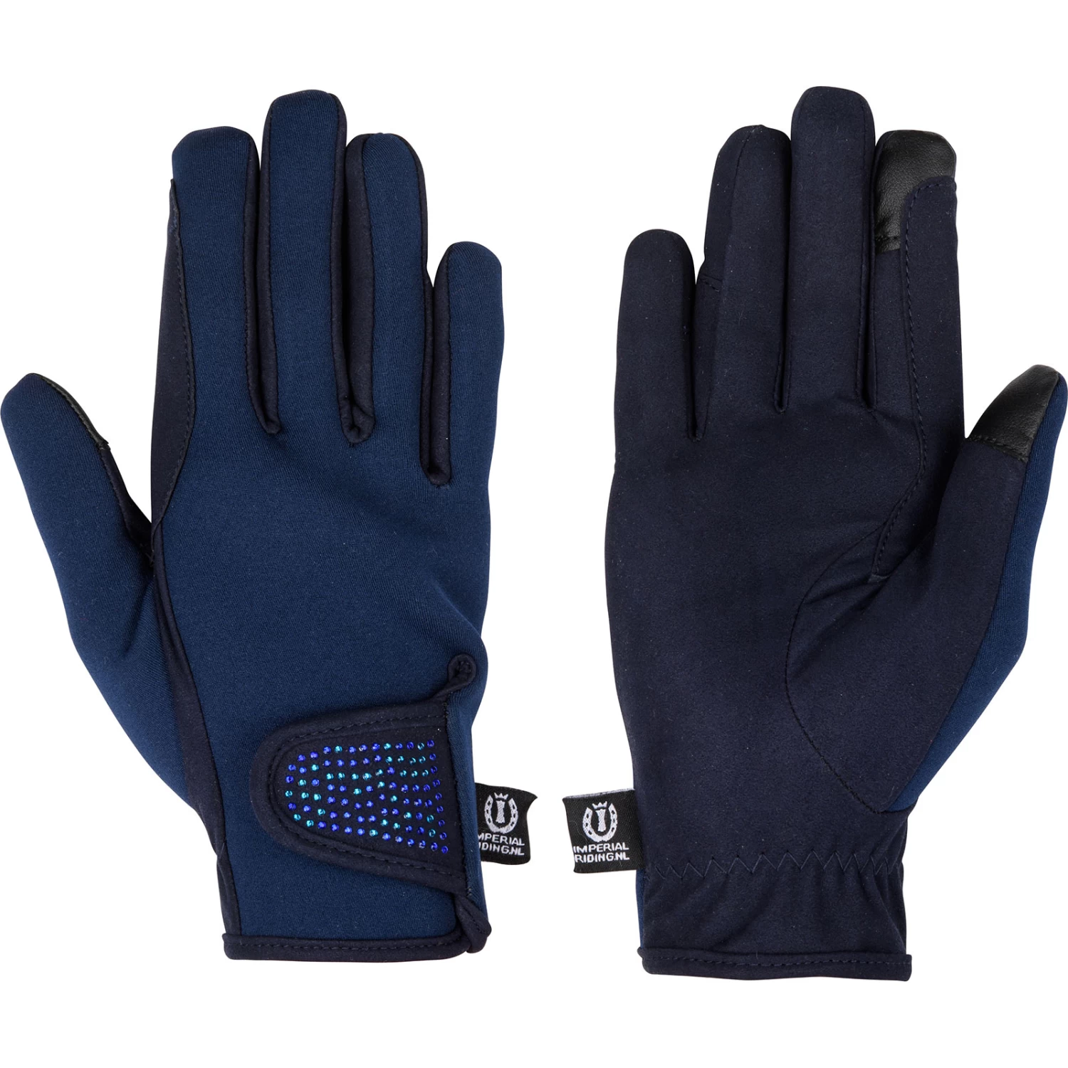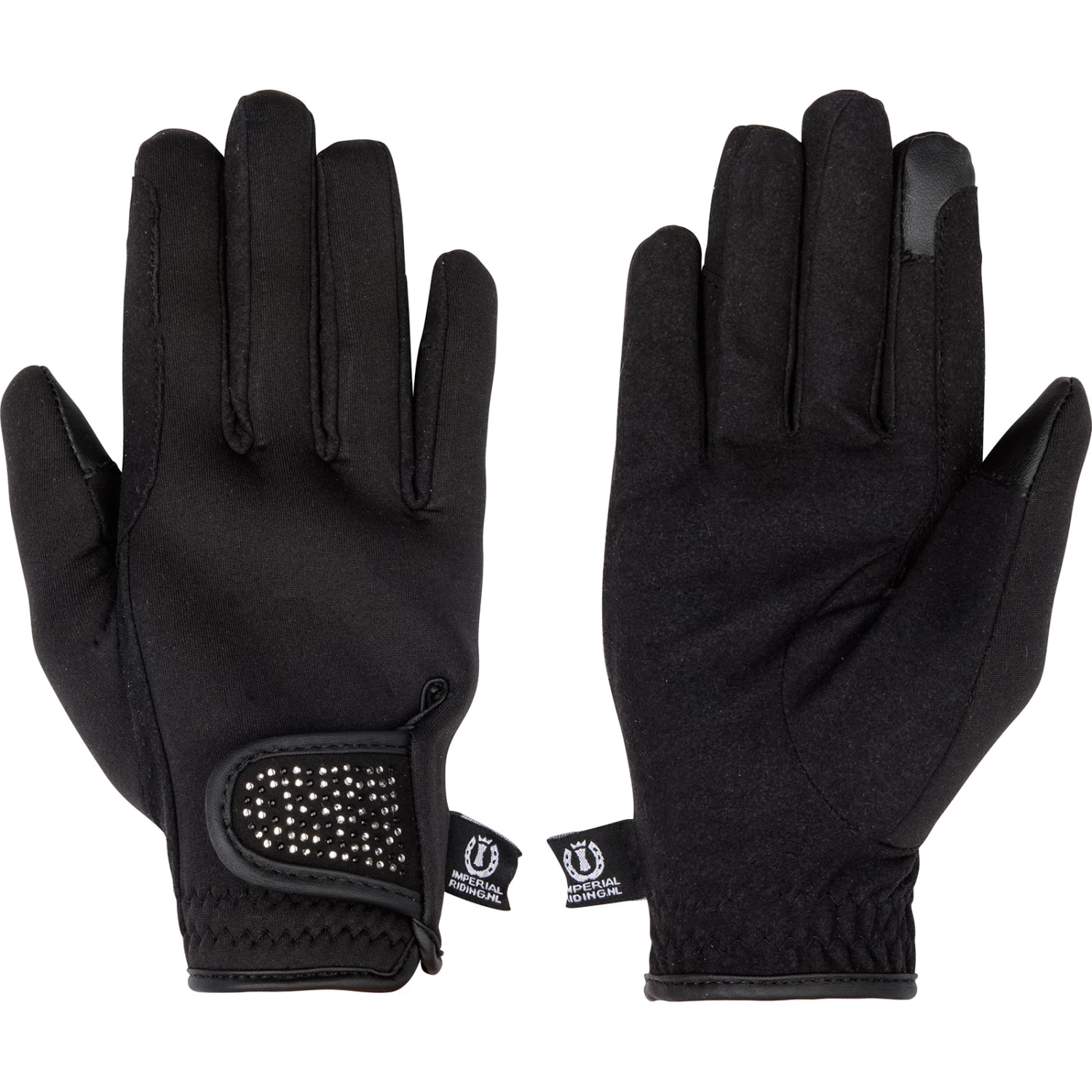 These gloves from Imperial Riding are nice and warm and feature beautiful rhine stones on the hook-and-loop closure. The tops of the index finger and thumb are made for using touch screens.