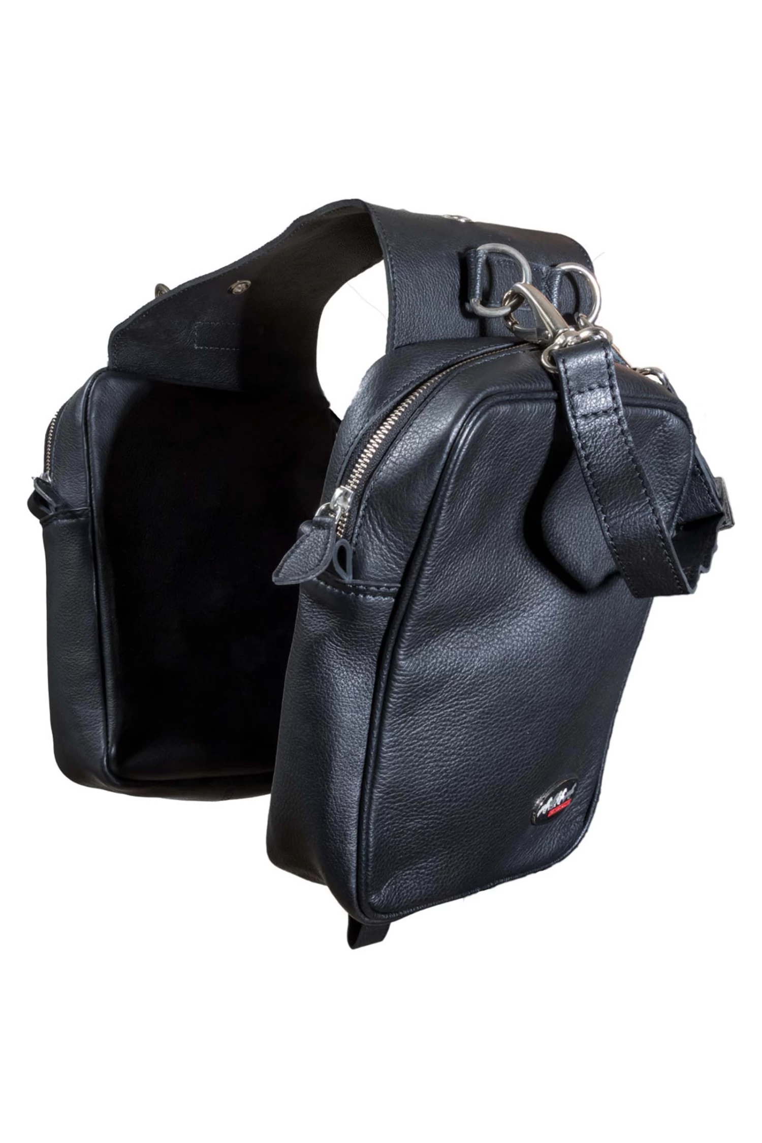 Leather saddlebags in great quality. Fastened securely with 2 straps to the saddle. It can be used both in front and behind the saddle. With a compartment on each side of the horse, with zipper closure.
