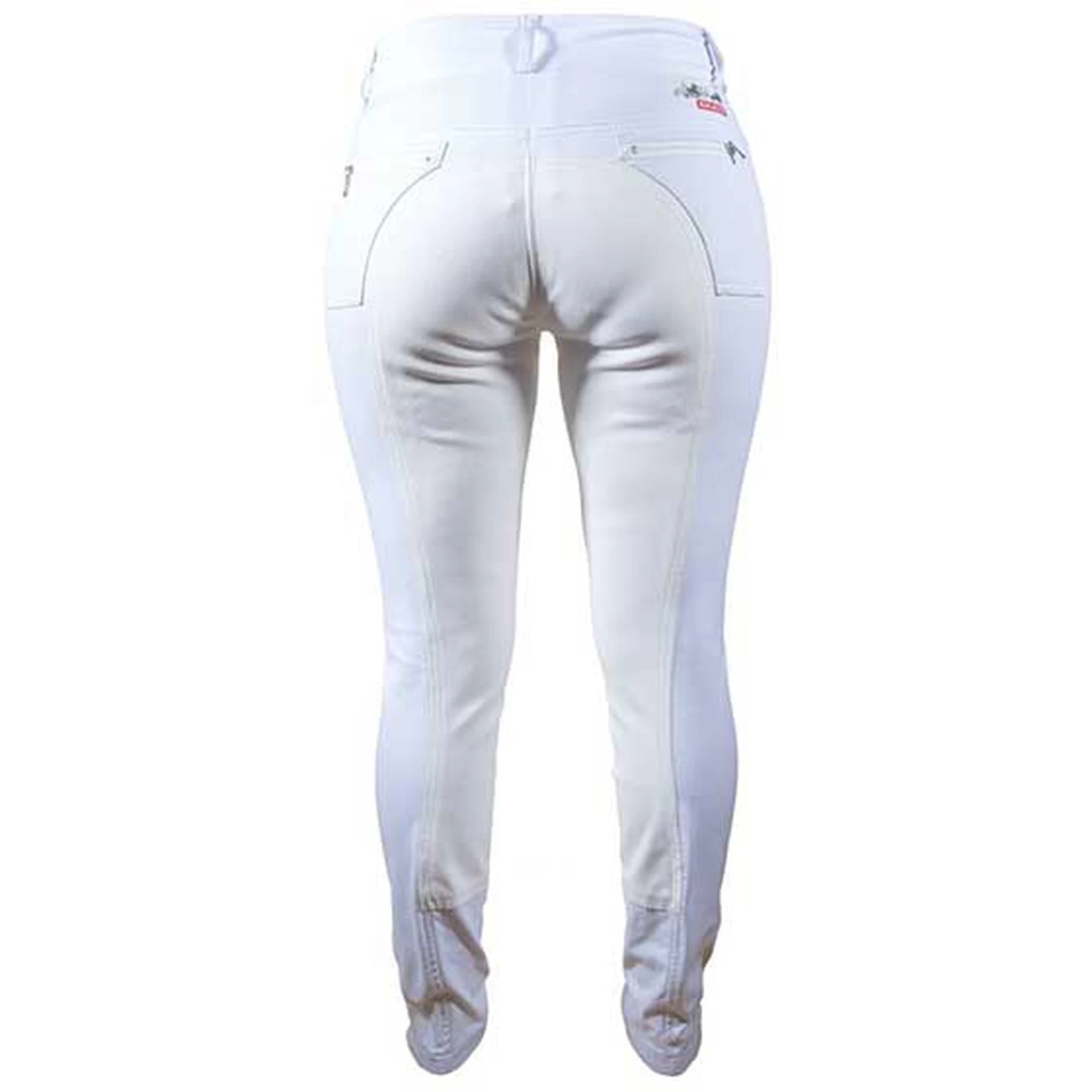 White competition breeches with full seat in absolute top quality. Made in very nice 4-way stretch and dirt repelling fabric. Elastic leg opening for use with long riding boots. These breeches have a good and very popular fit, as well as a good comfort. Two pockets in the front, and icelandic horse embrodidery and two pockets on the rear.