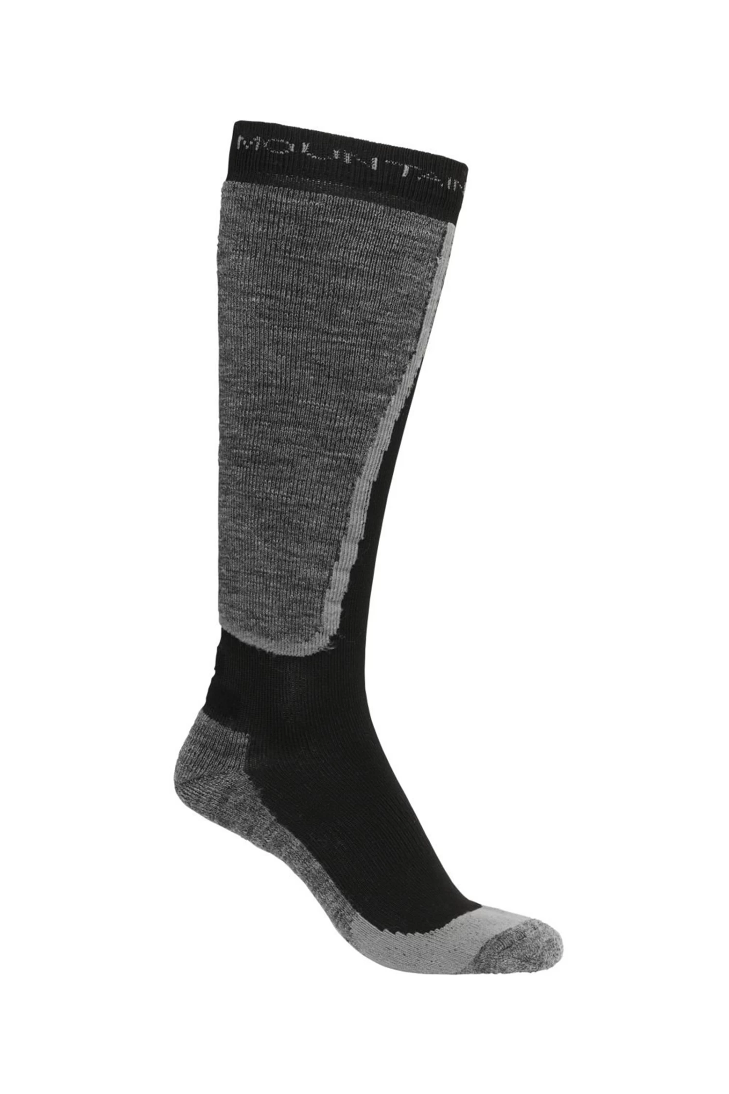High performance warm riding socks with merino wool sections that provide warmth at outer leg and foot.