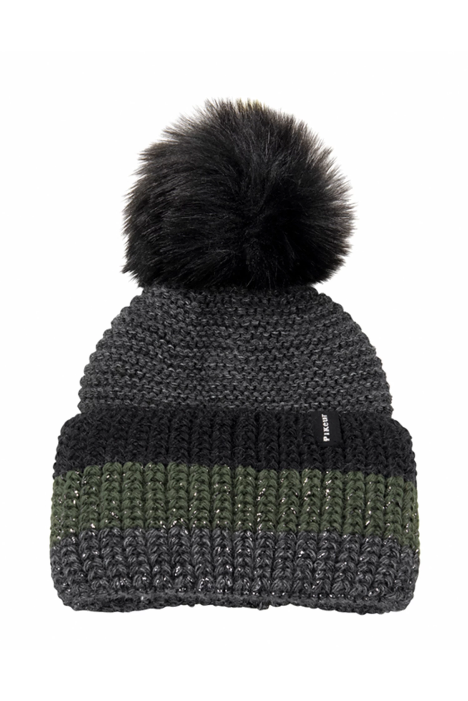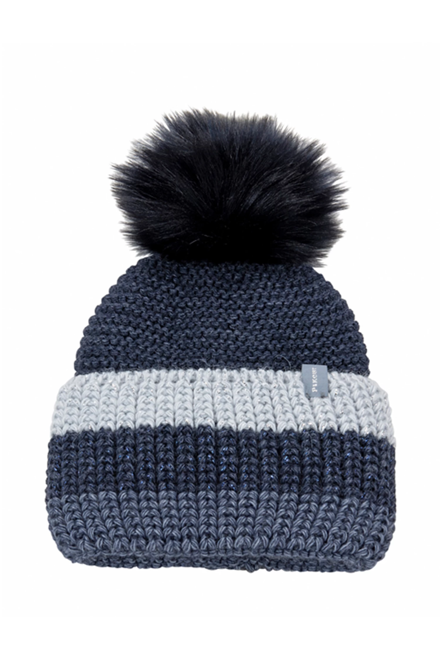 Knitted hat with 3 coloured wide brim, glitter thread and pom pom.