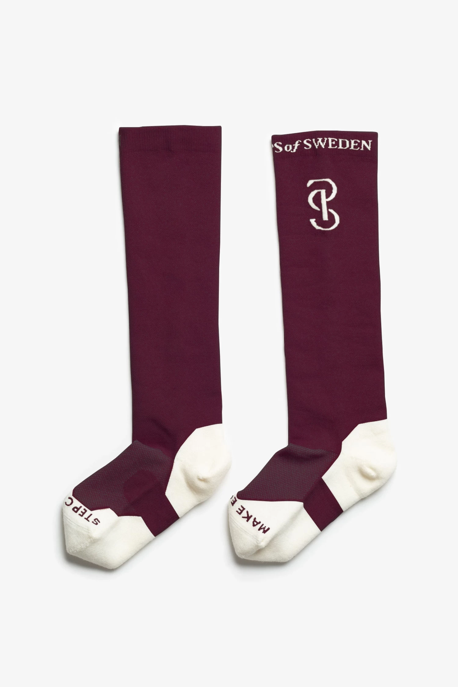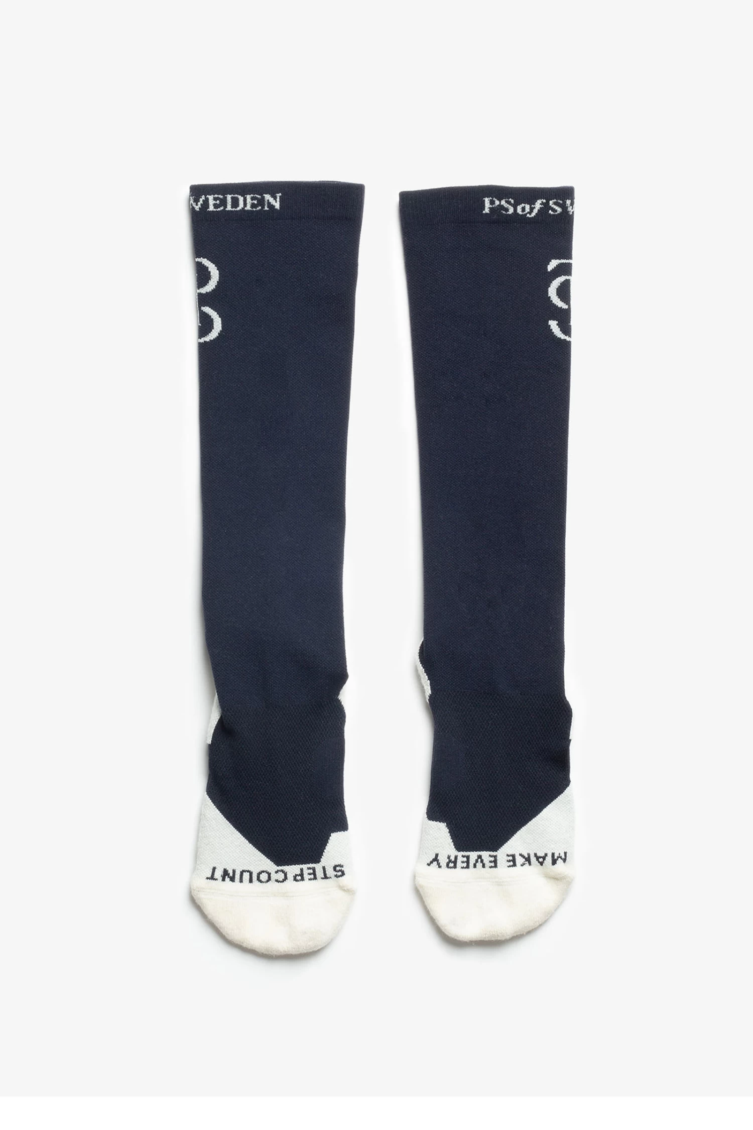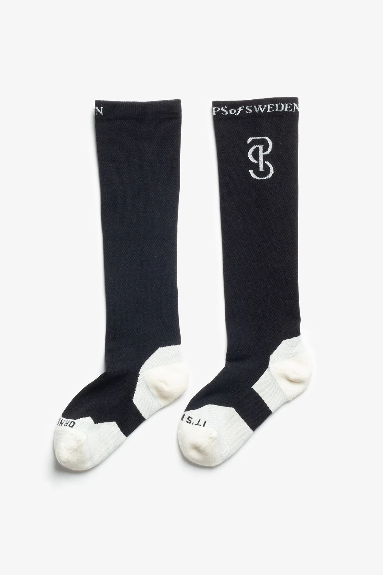 Knee-high riding socks in soft compression pique stitch. Contrast colored toe and heel reinforcements, with a fine rib in between, and mesh insert at mid-foot.