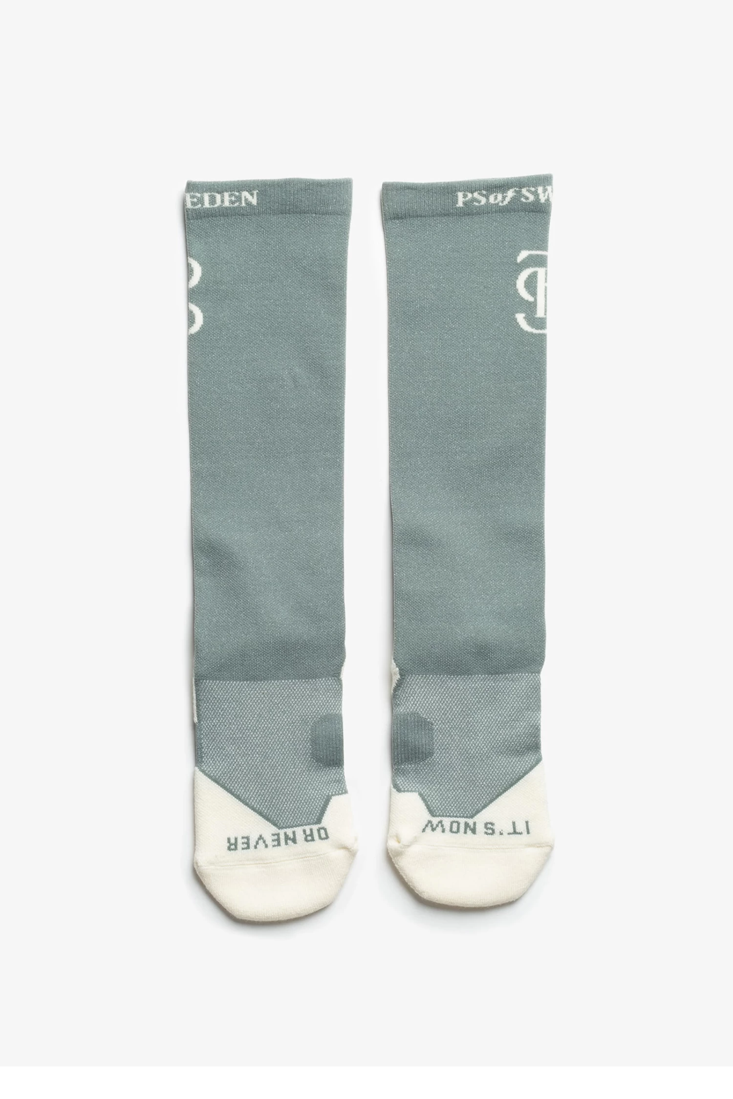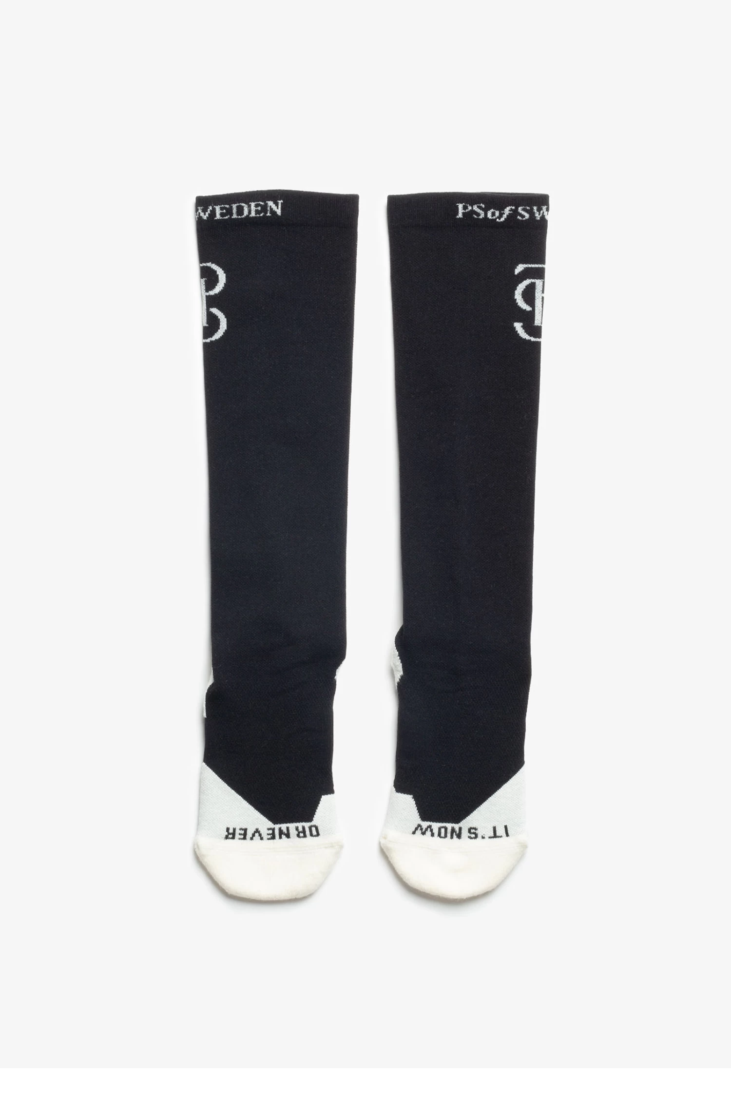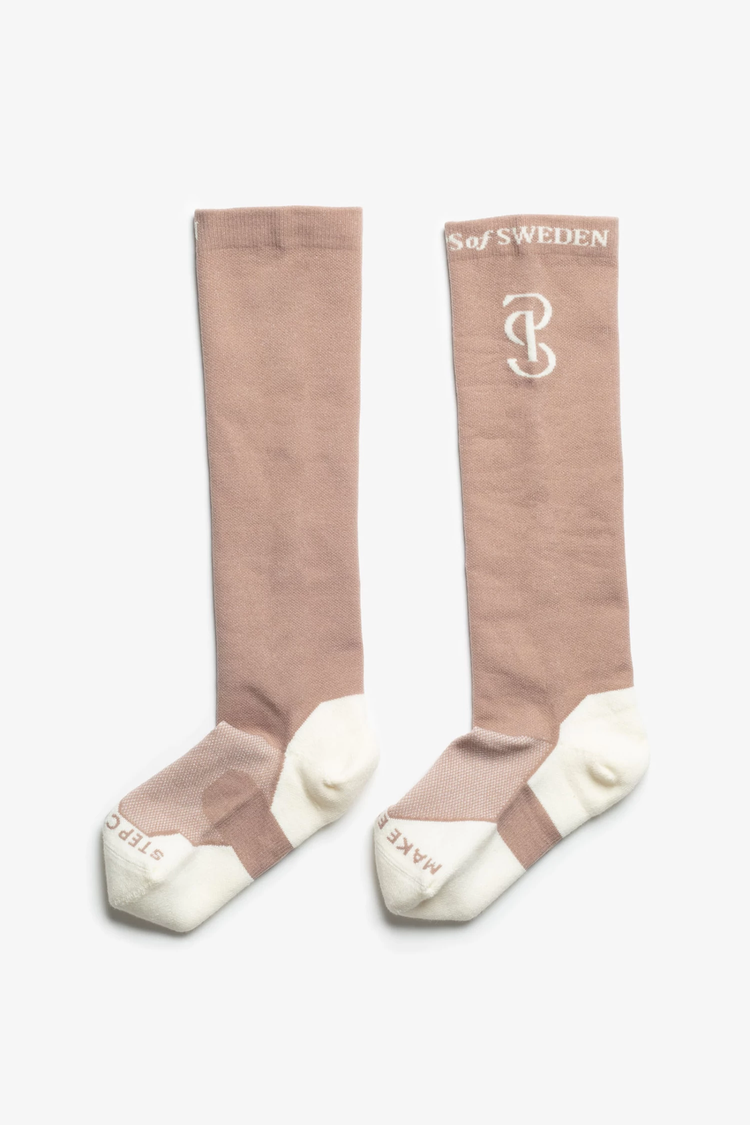 Knee-high riding socks in soft compression pique stitch. Contrast colored toe and heel reinforcements, with a fine rib in between, and mesh insert at mid-foot.