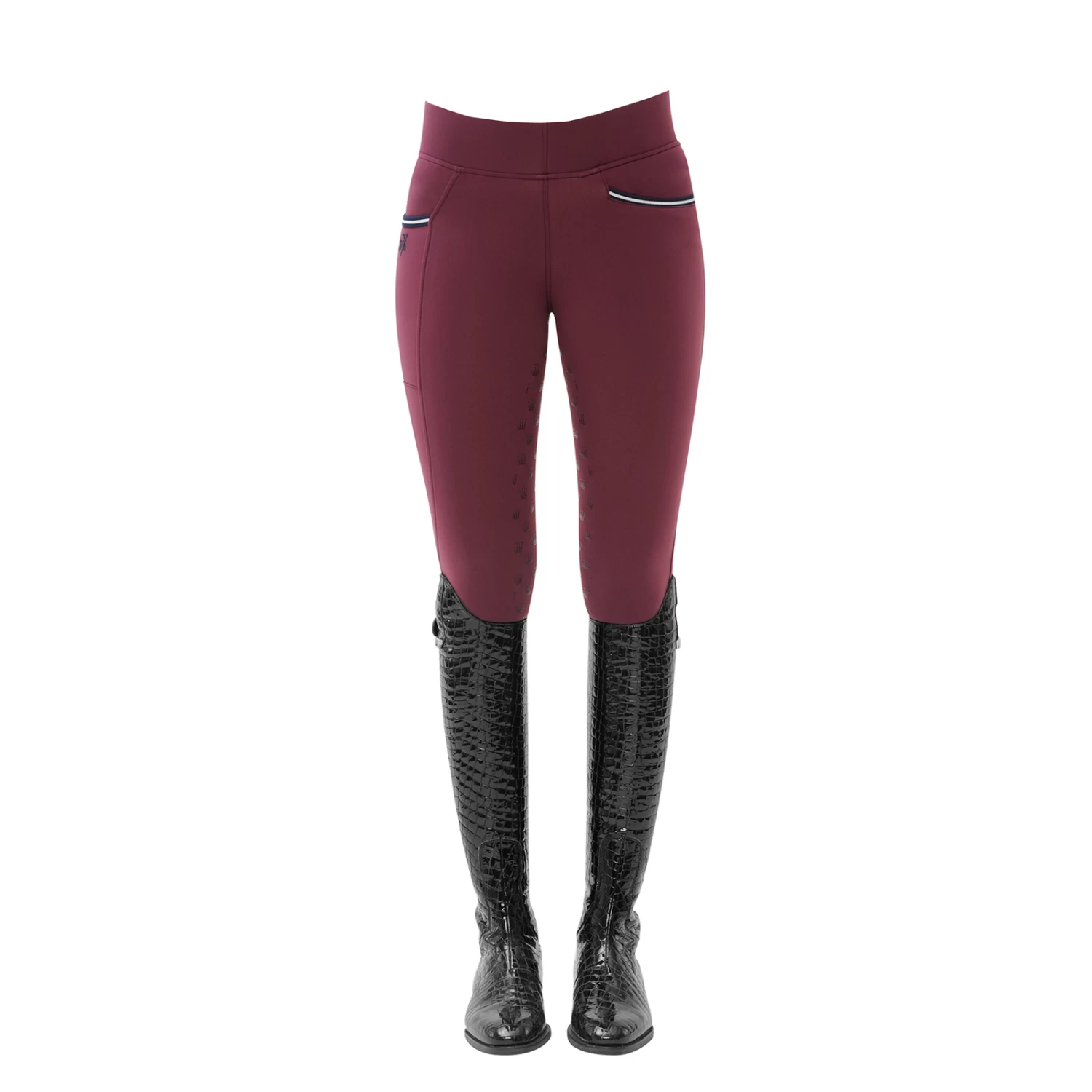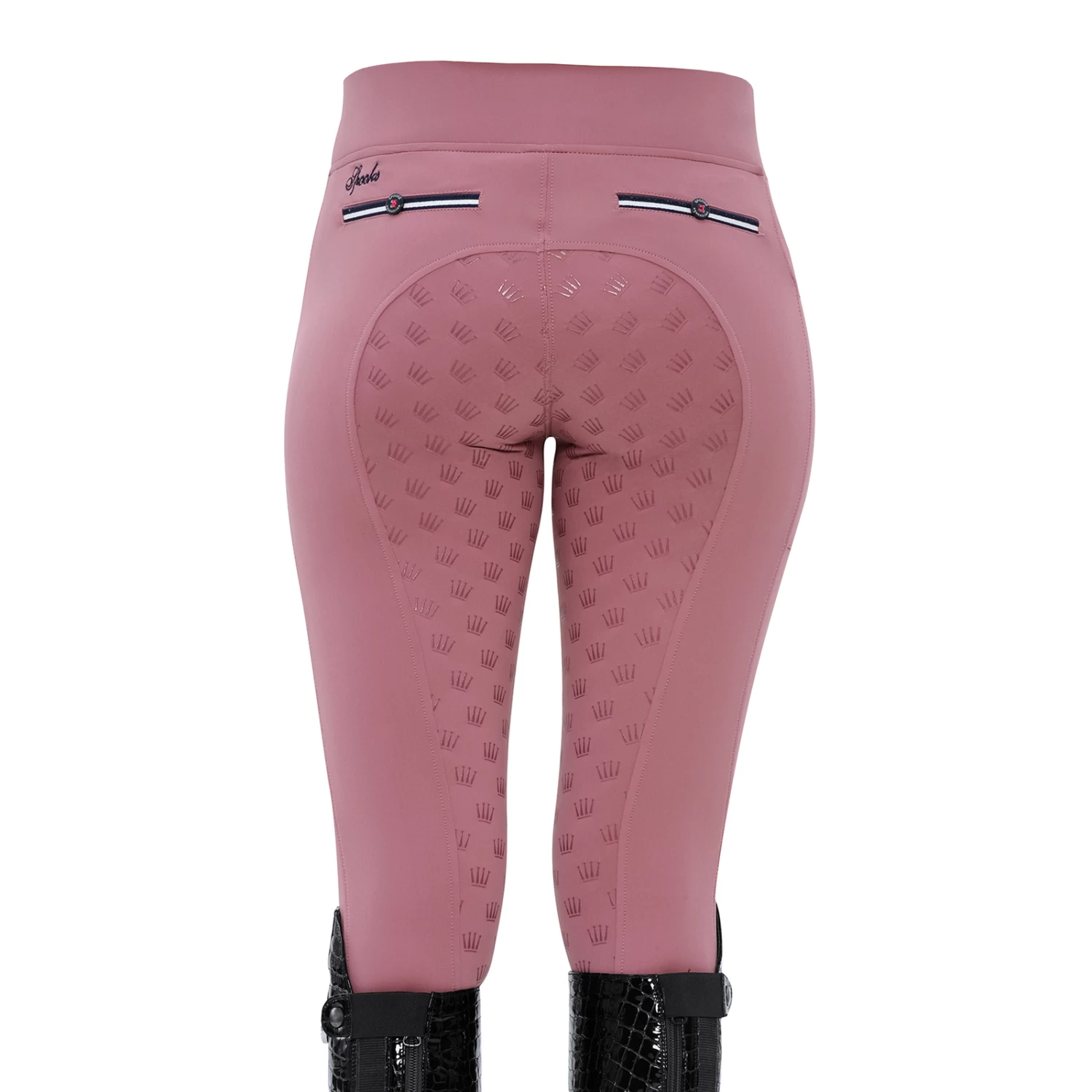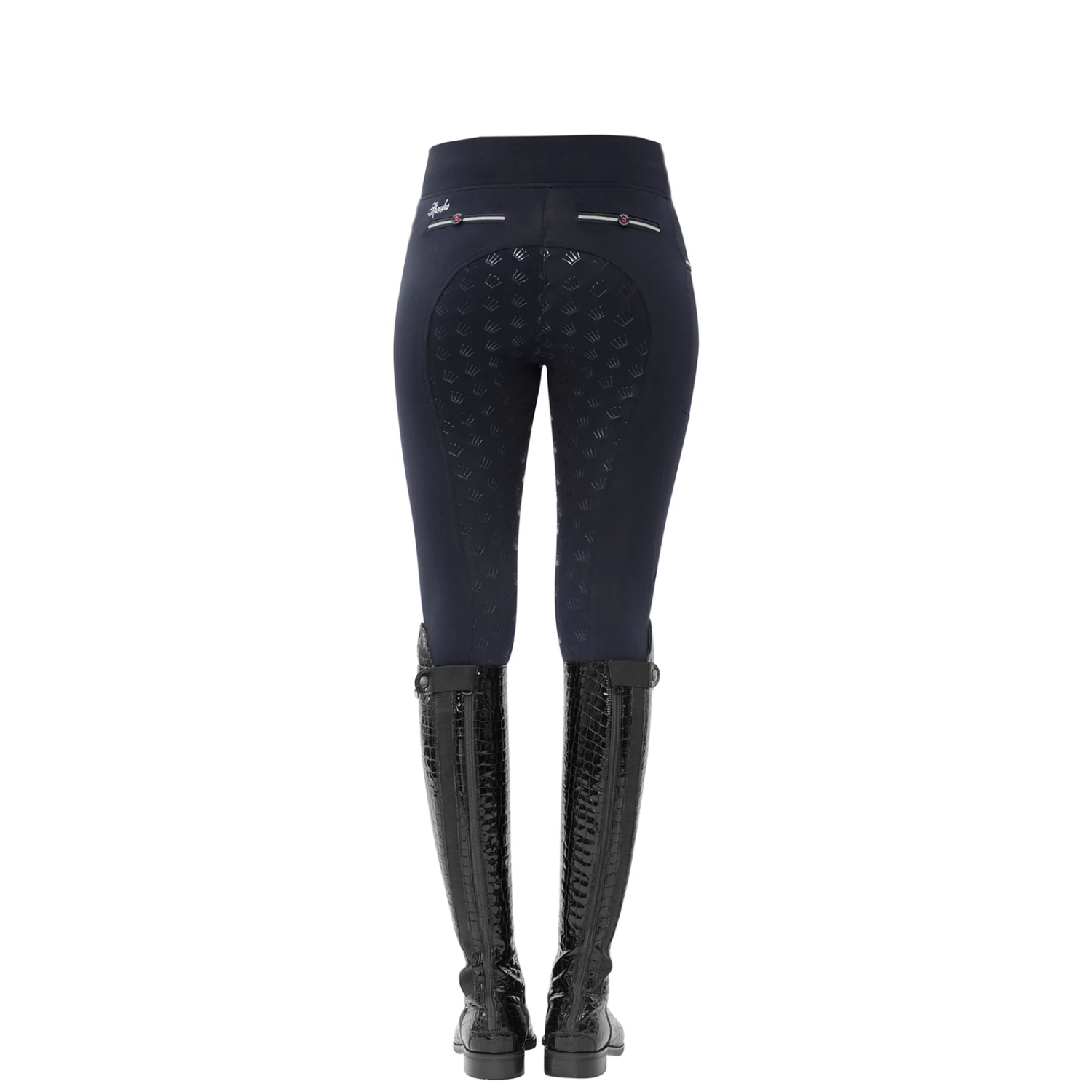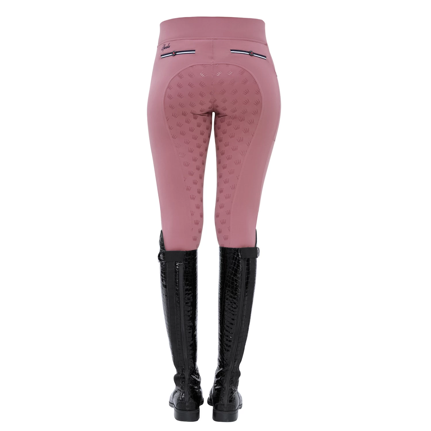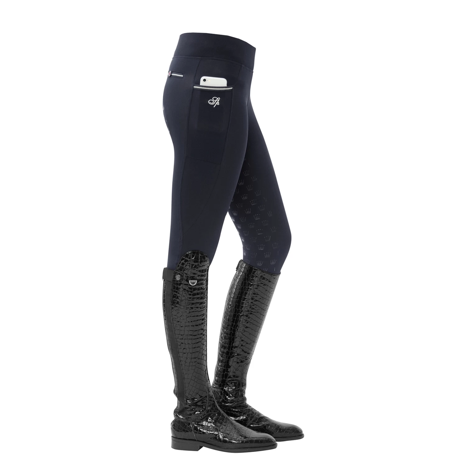 Super light riding leggins with crown-grip and an extra high waistband for a perfect fit. On the right side there is a practical mobile phone pocket. In addition, the breeches have a usable front pocket and two decorative back pockets.