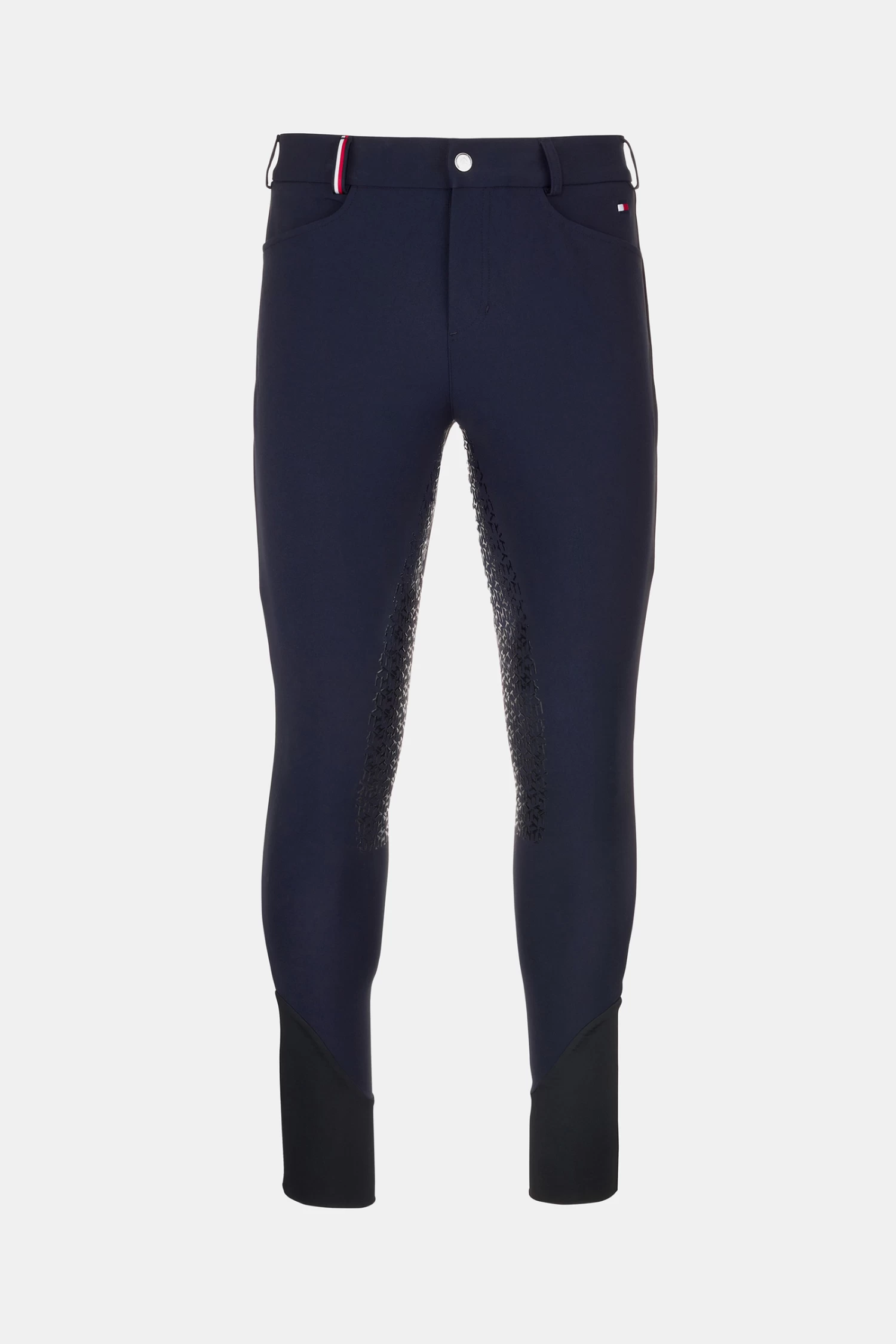 Classic all-season full-grip breeches with two denim pockets at the front and two dummy flap pockets with button at the back. Elasticated jersey cuffs for easy entry. Front waistband closure with hook and additional safety button. Logo embroidery on the front side below the waistband. TH Global Stripe application on one belt loop at the front and on the two middle ones at the back.