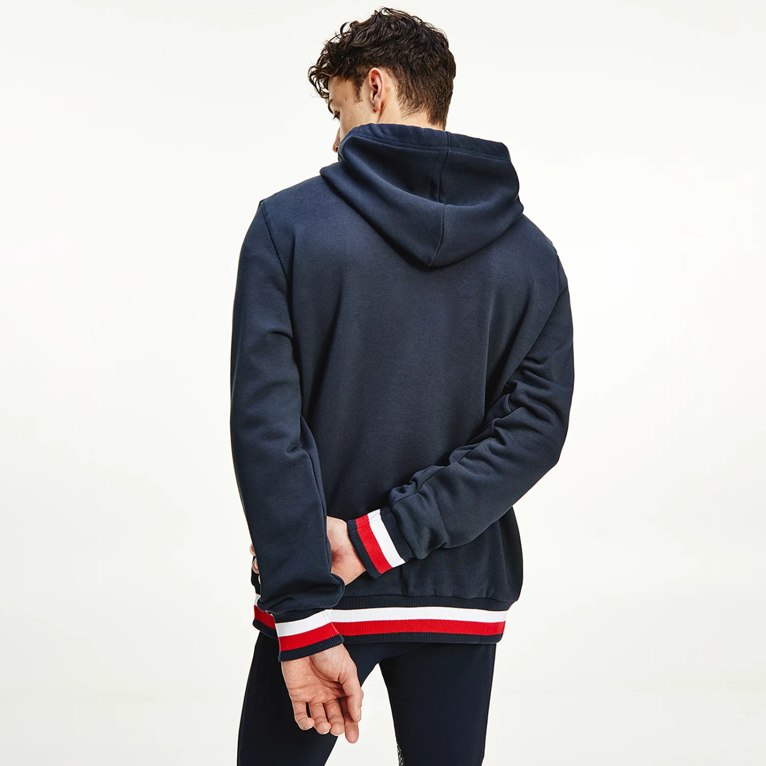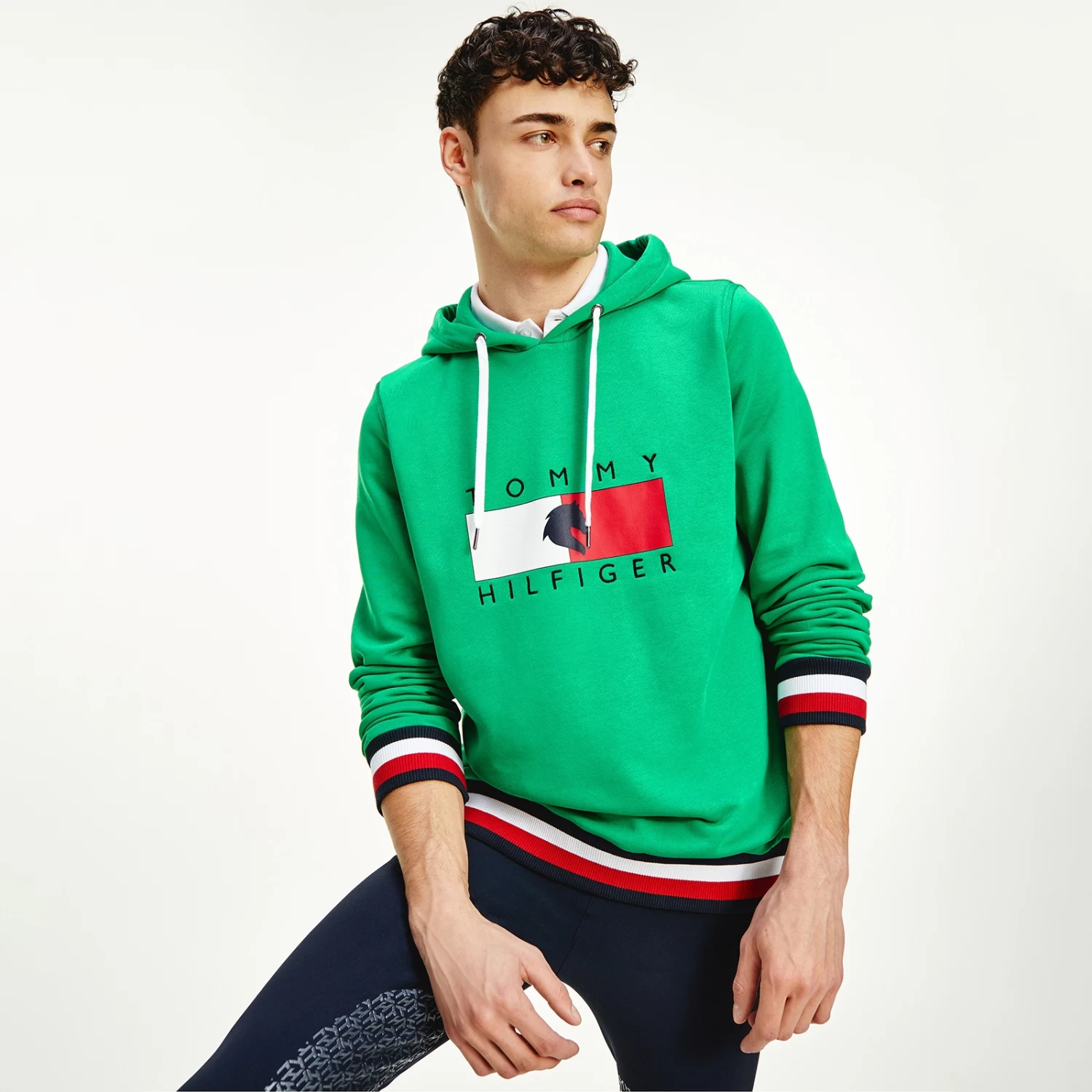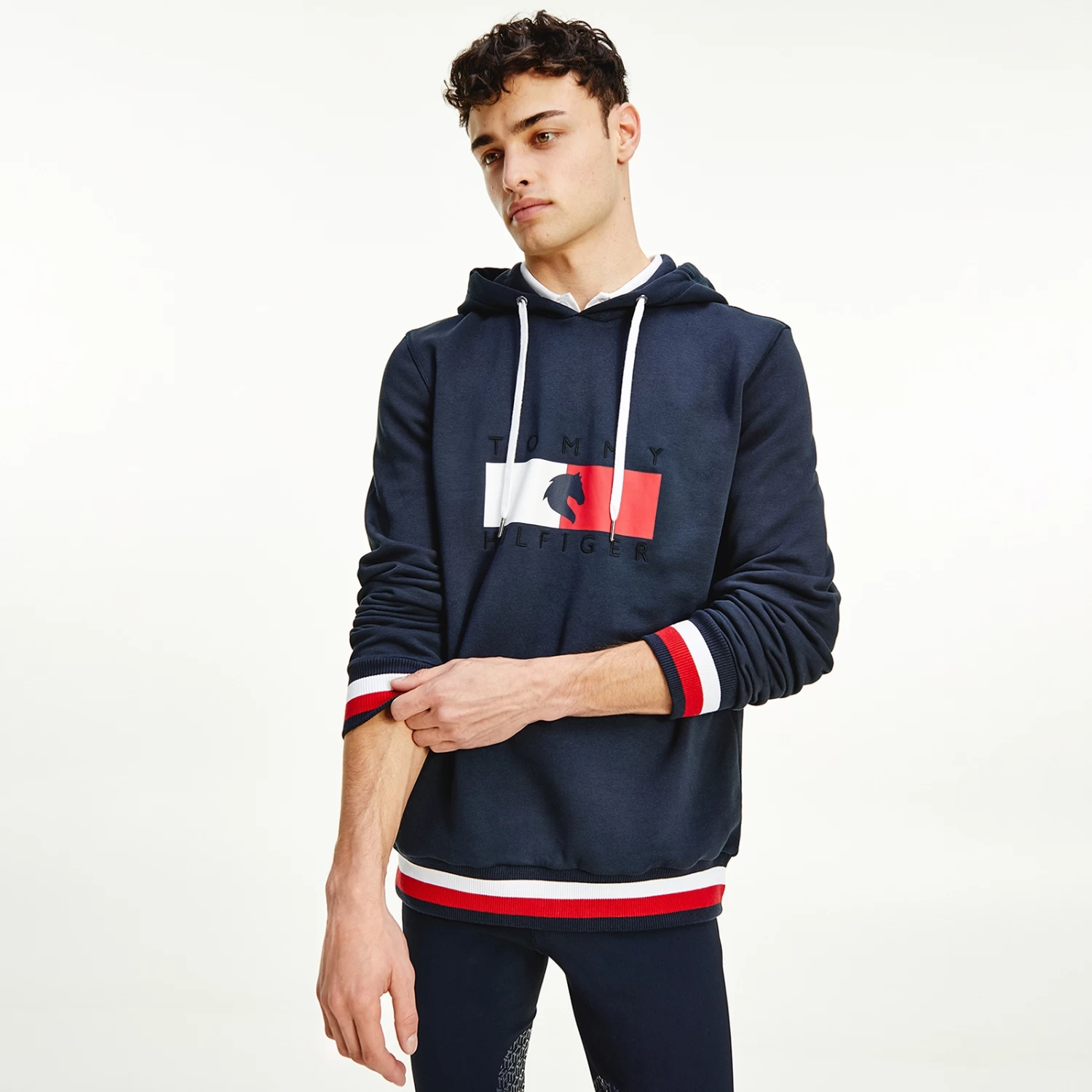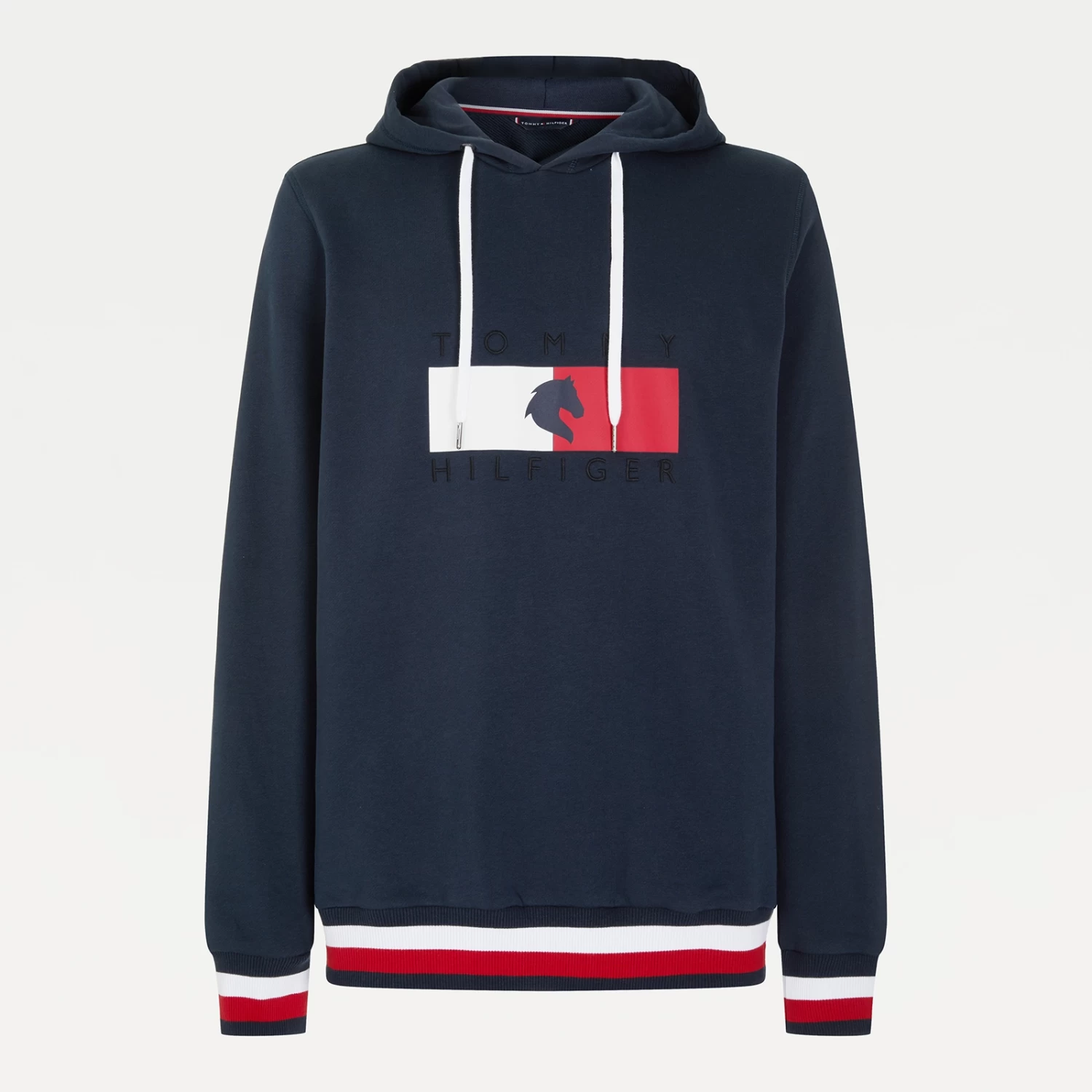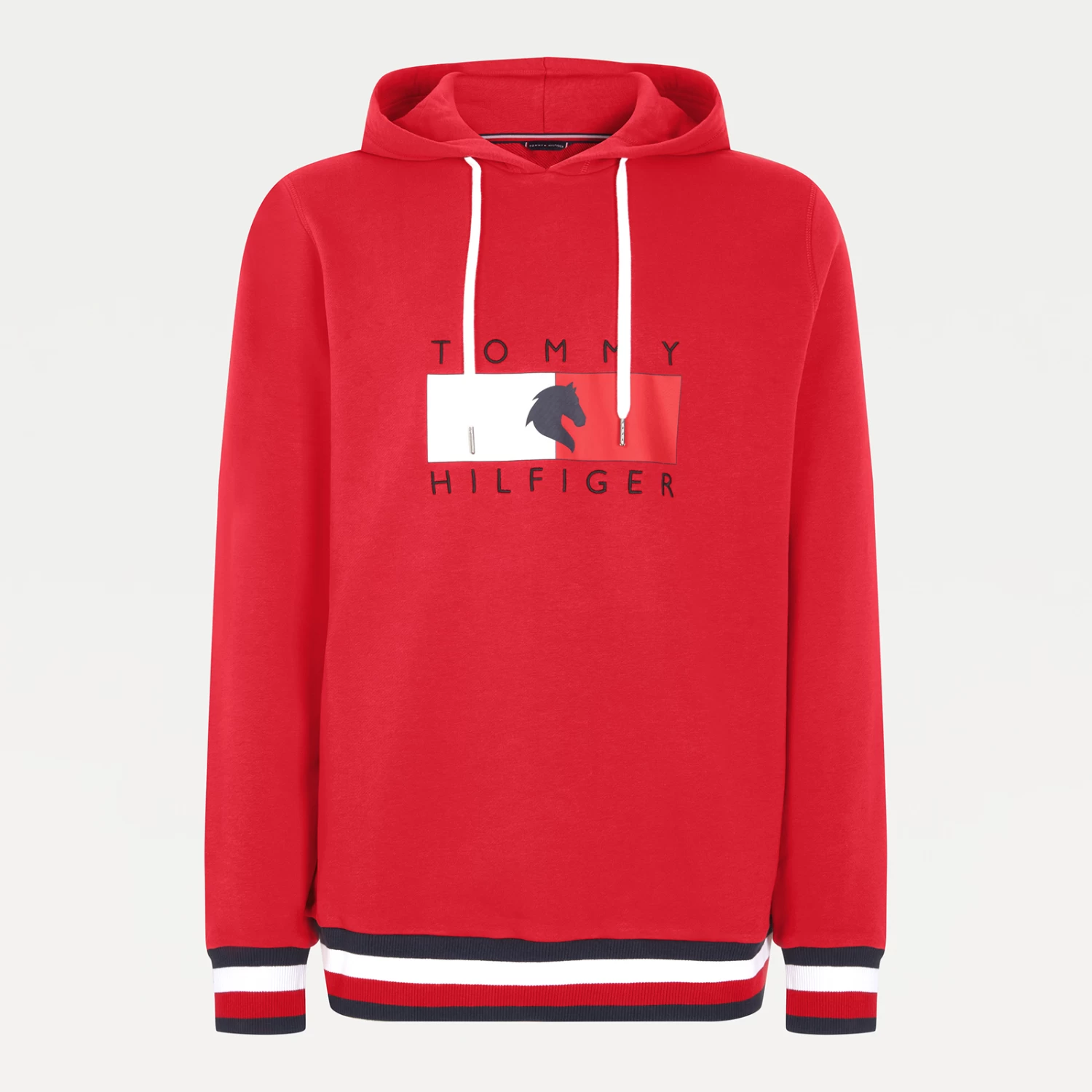 A regular-fit, versatile sweatshirt with hood and metal-tipped drawcords and logo print at chest. Eye-catching, three-color ribbing in the TH Global stripe optic at cuffs and bottom hem.