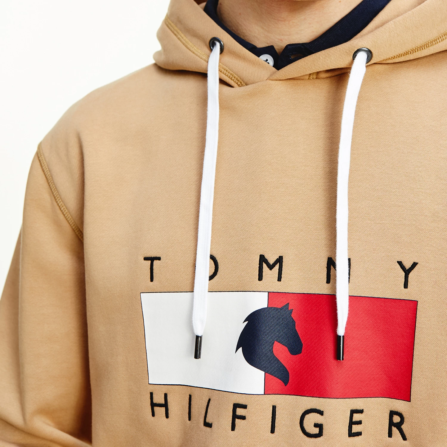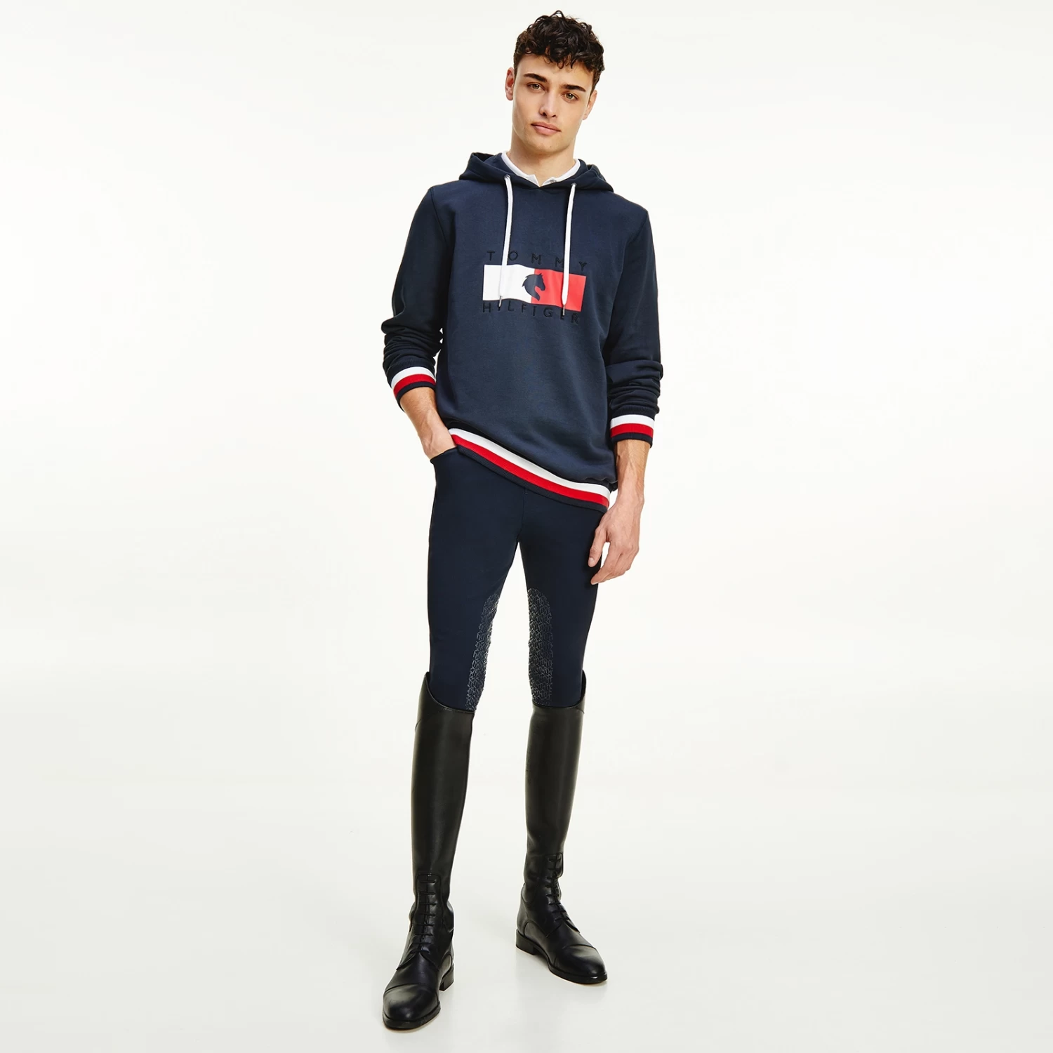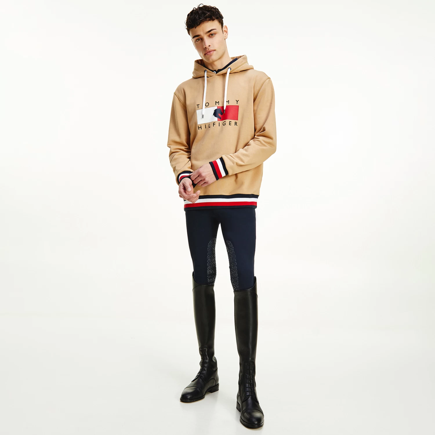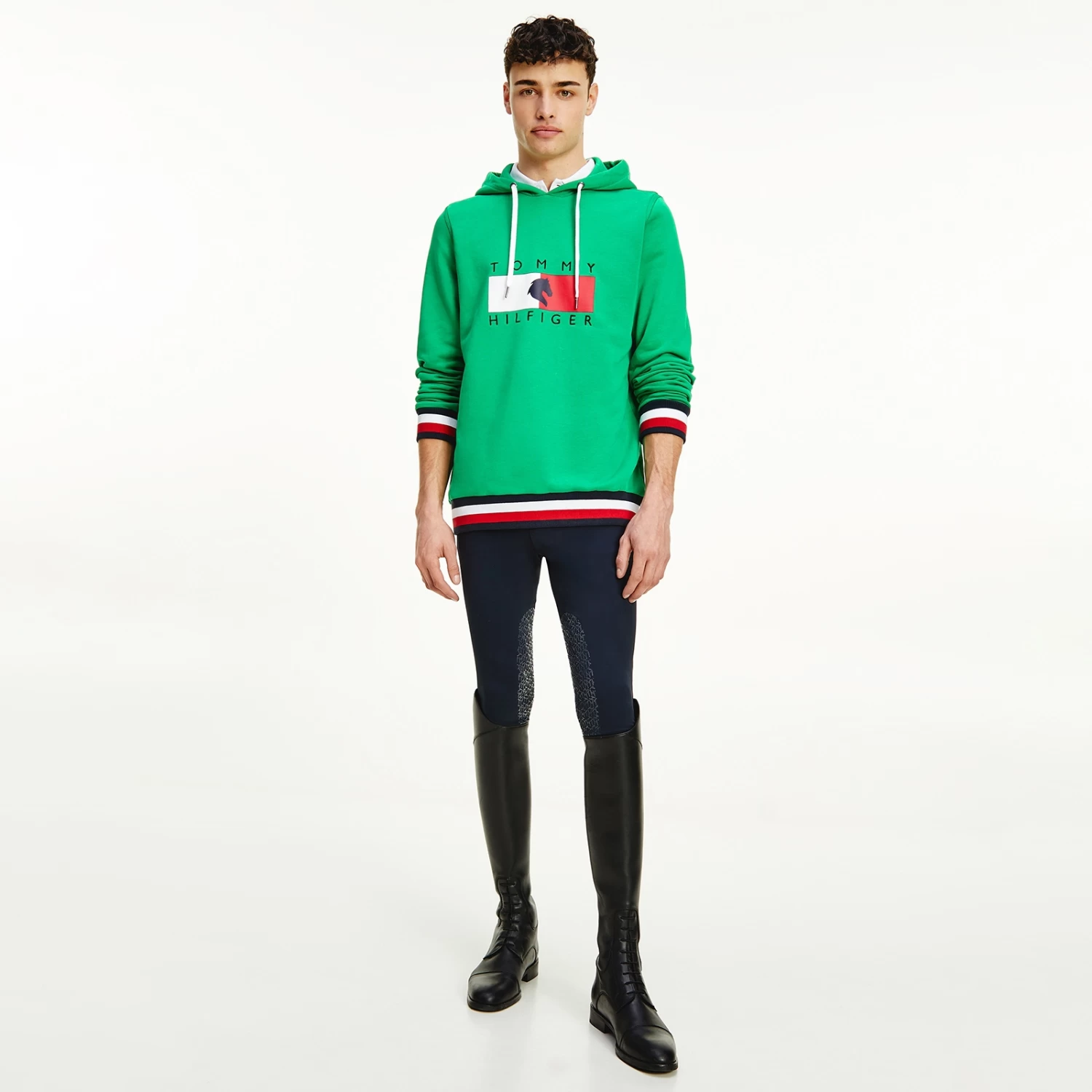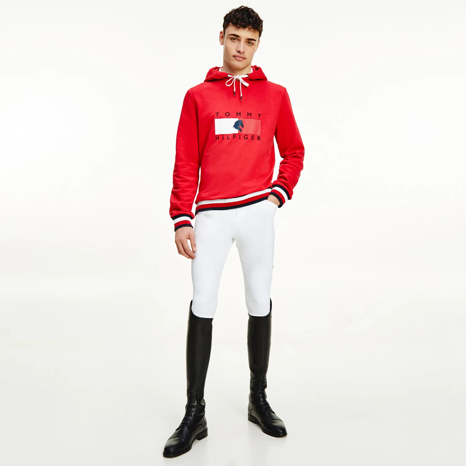 A regular-fit, versatile sweatshirt with hood and metal-tipped drawcords and logo print at chest. Eye-catching, three-color ribbing in the TH Global stripe optic at cuffs and bottom hem.