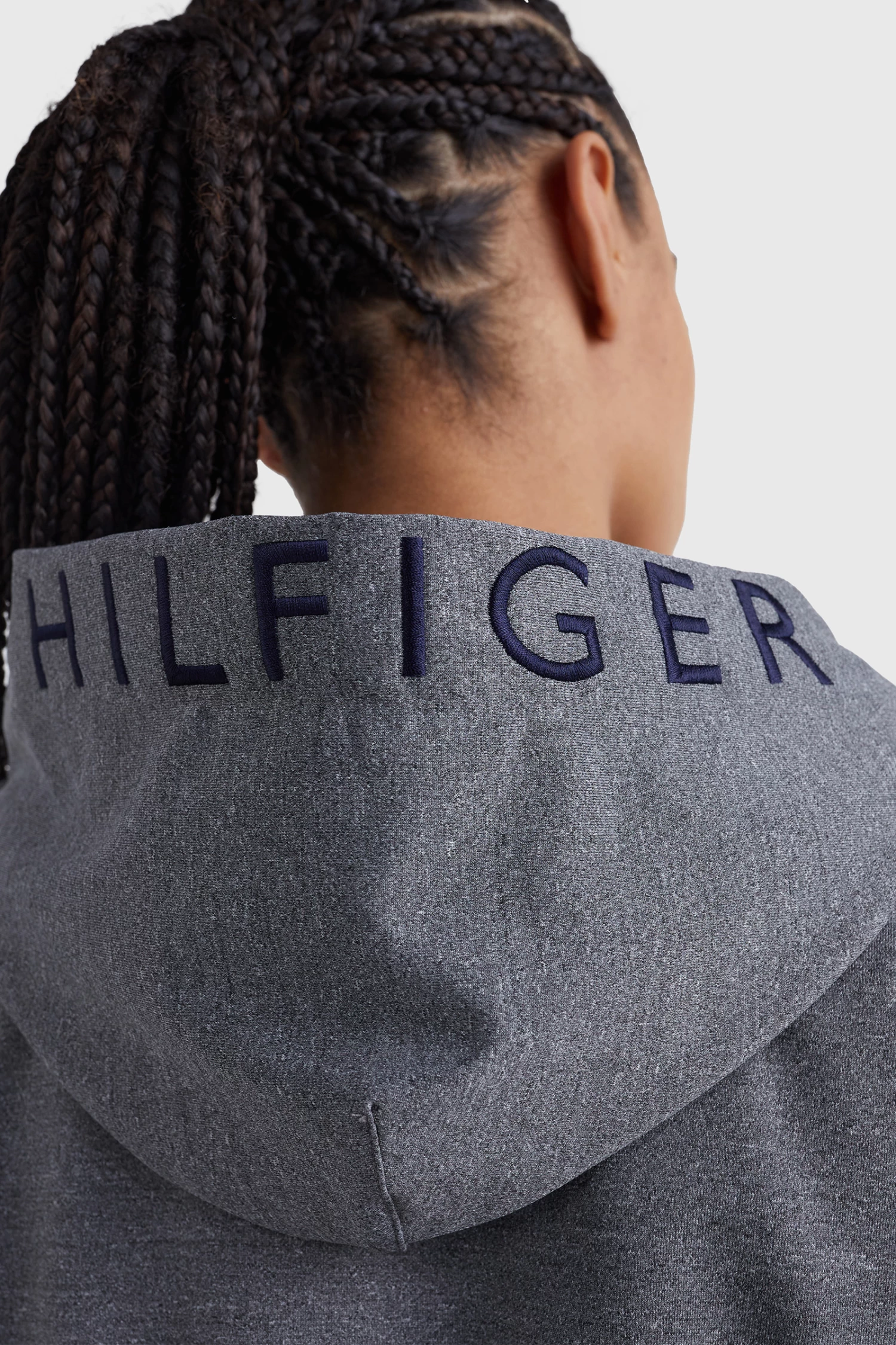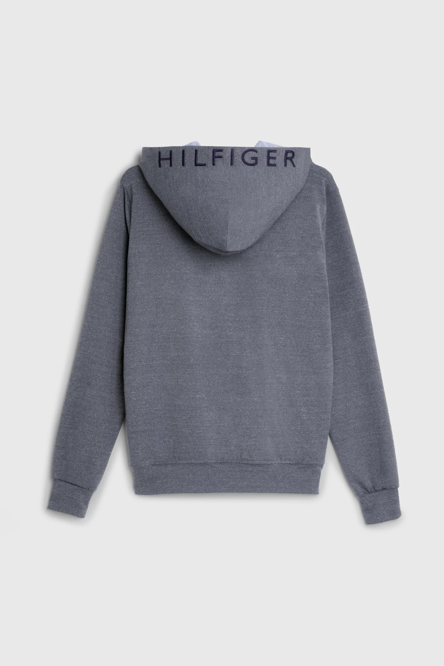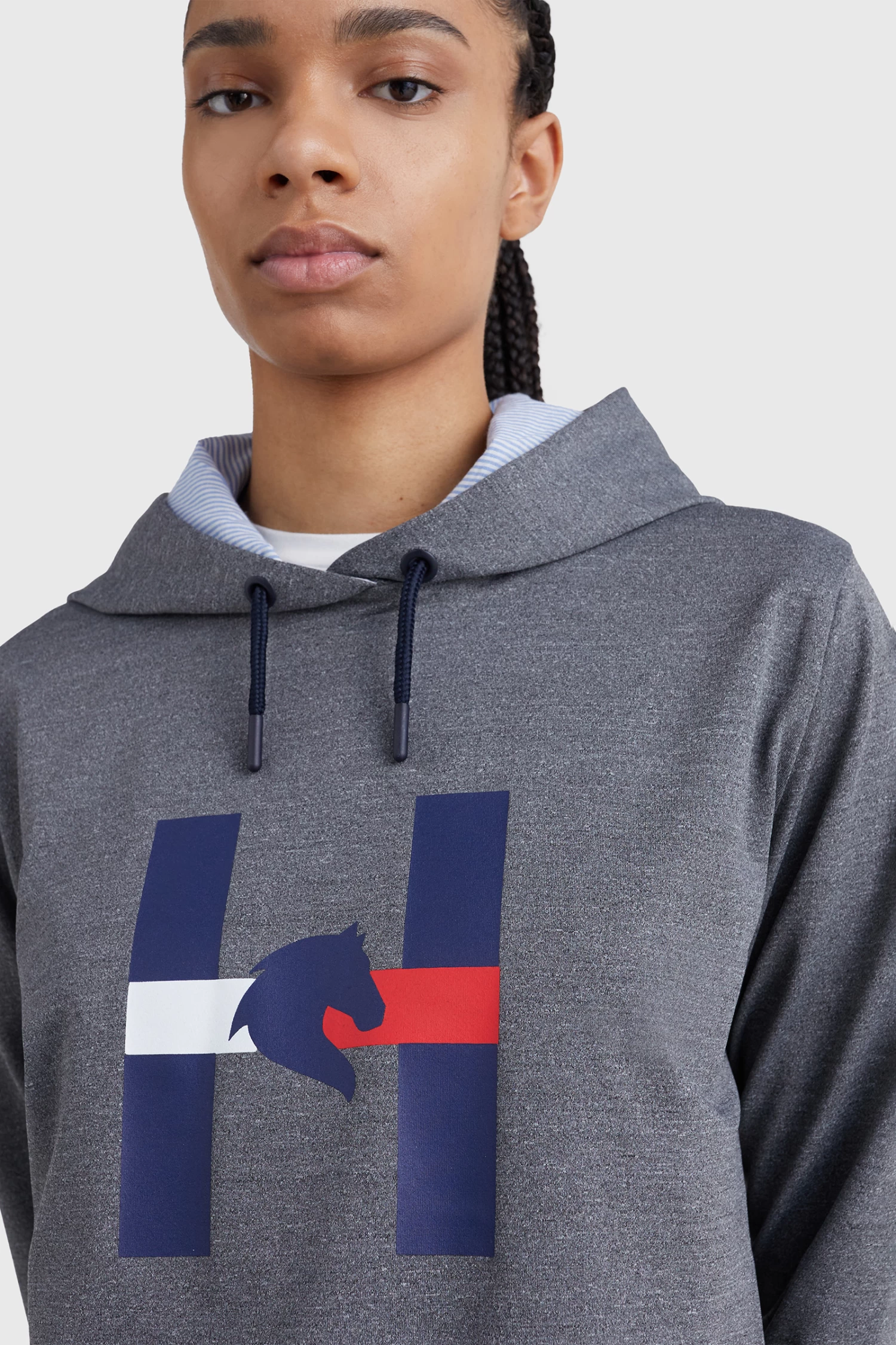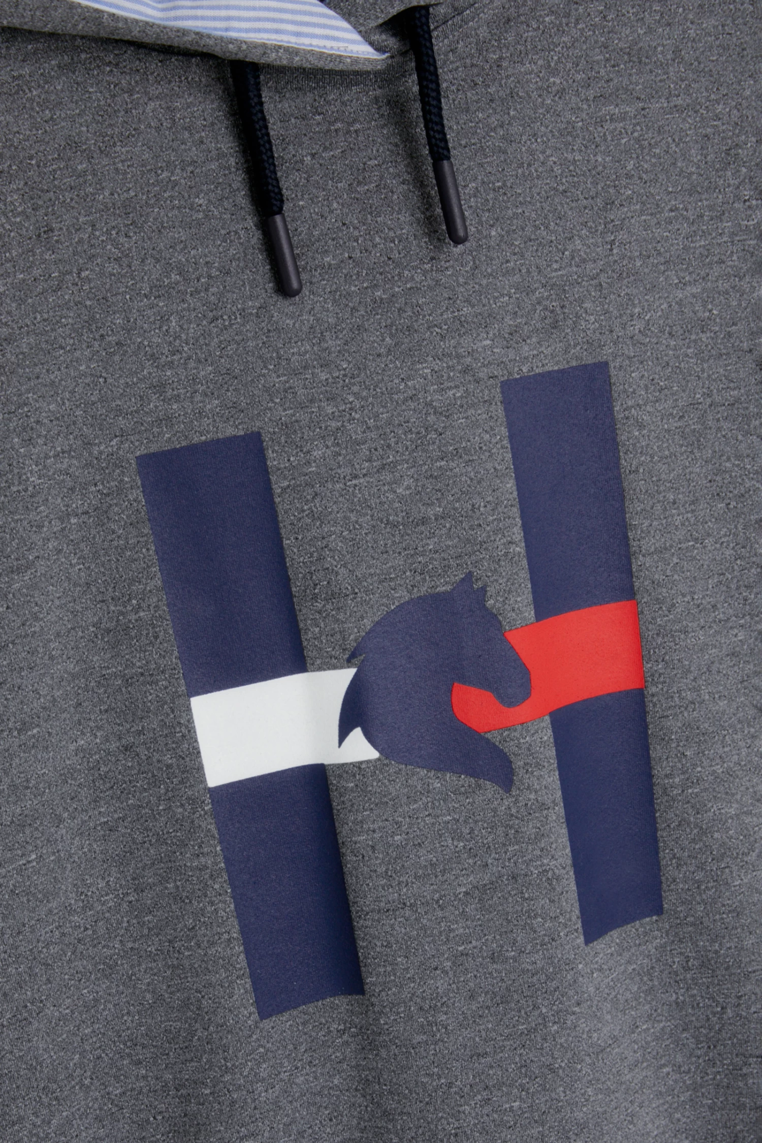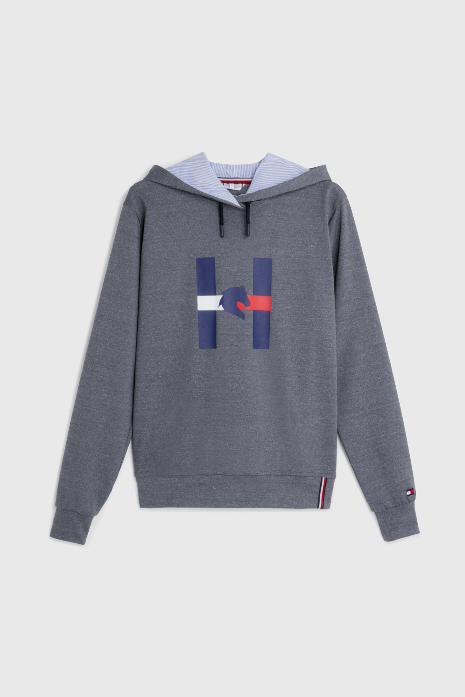 Hoodie with ribbed waistband and cuffs. The hood is lined with the Tommy Ithaca Stripe look and has drawstrings with rubberized closures. Features Hilfiger embroidery over the outer hood area and H Horse graphic print on the chest.