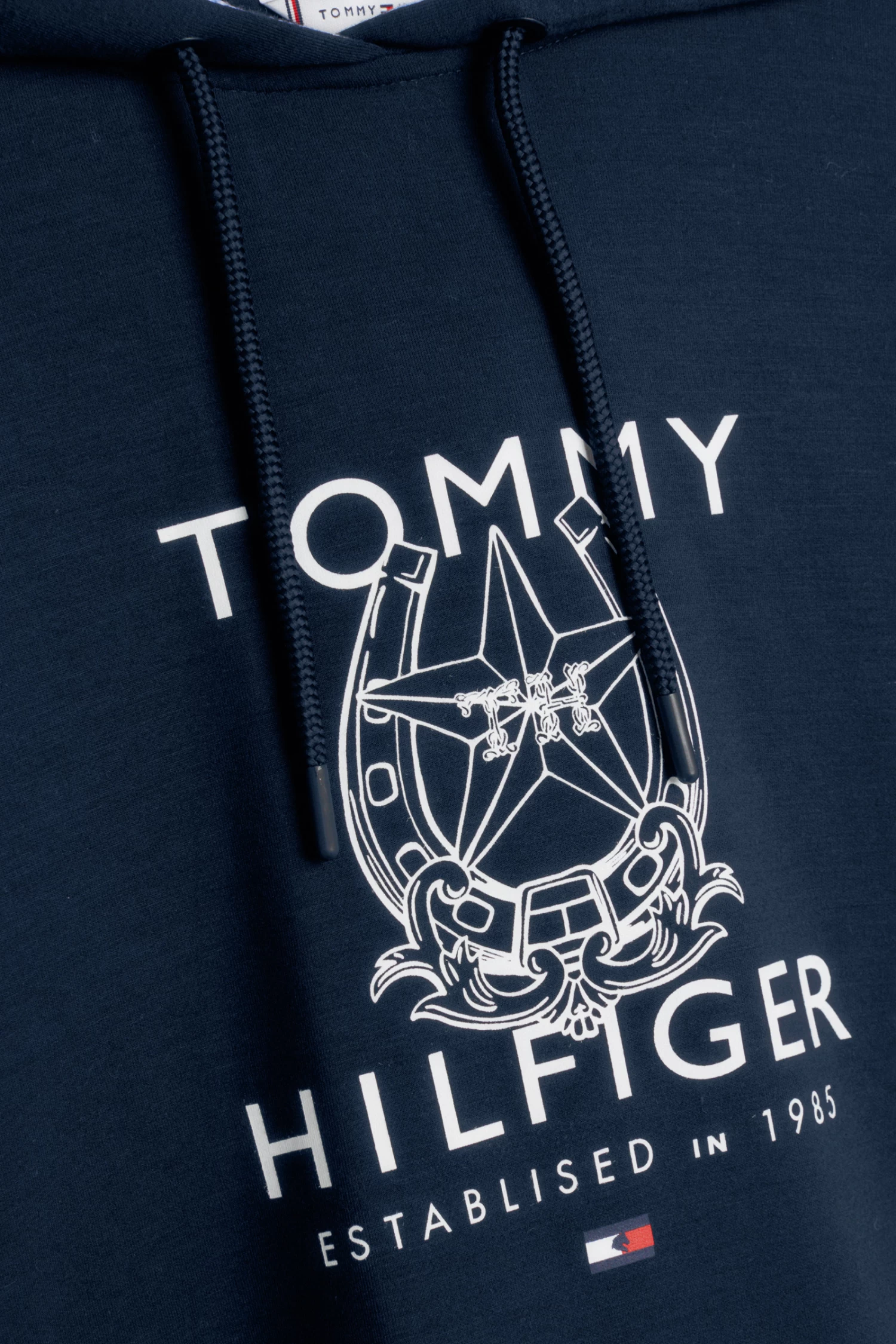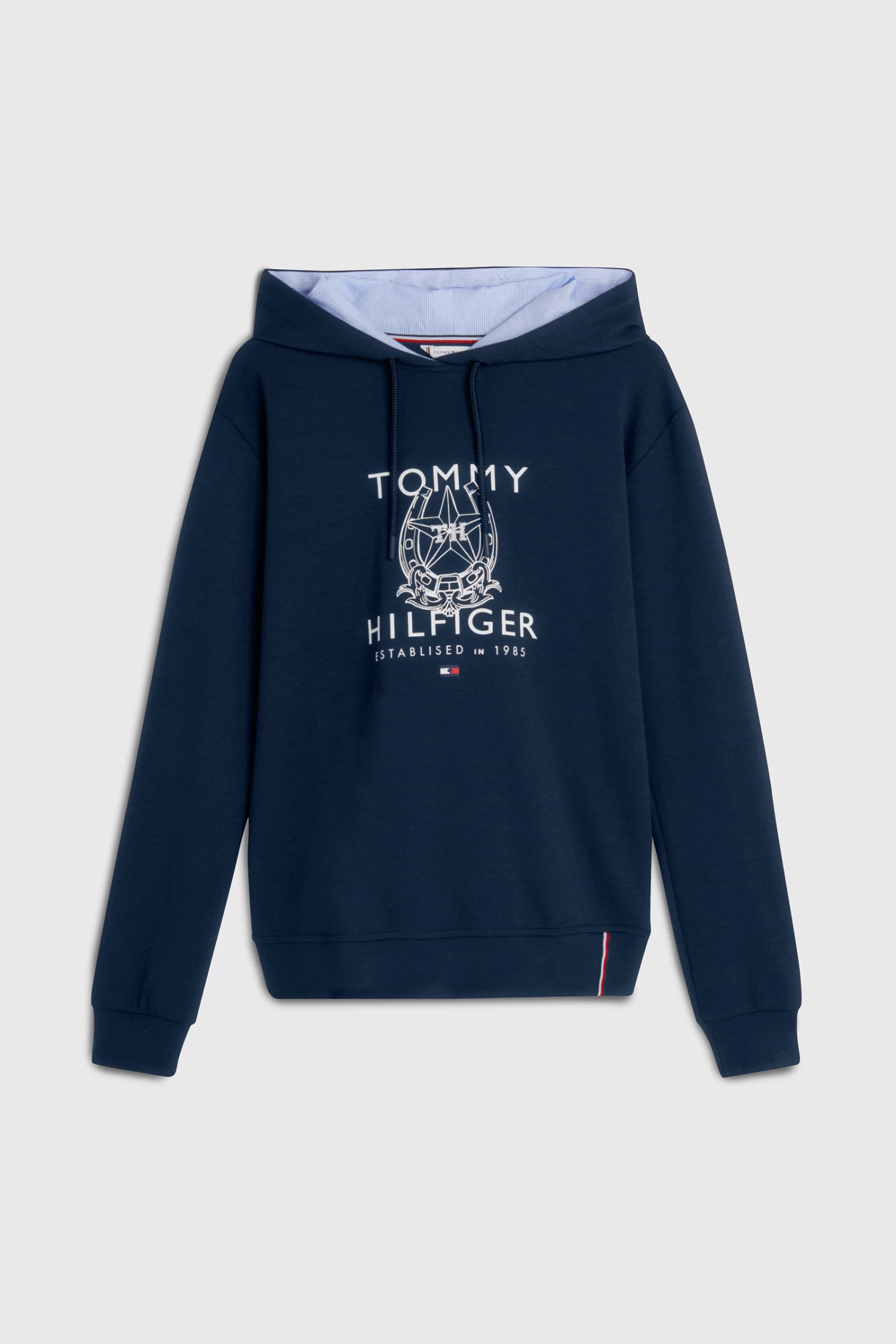 Hoodie with ribbed waistband and cuffs. Features a nautical style horse shoe print on the front and hood with drawstrings with rubberized closures.