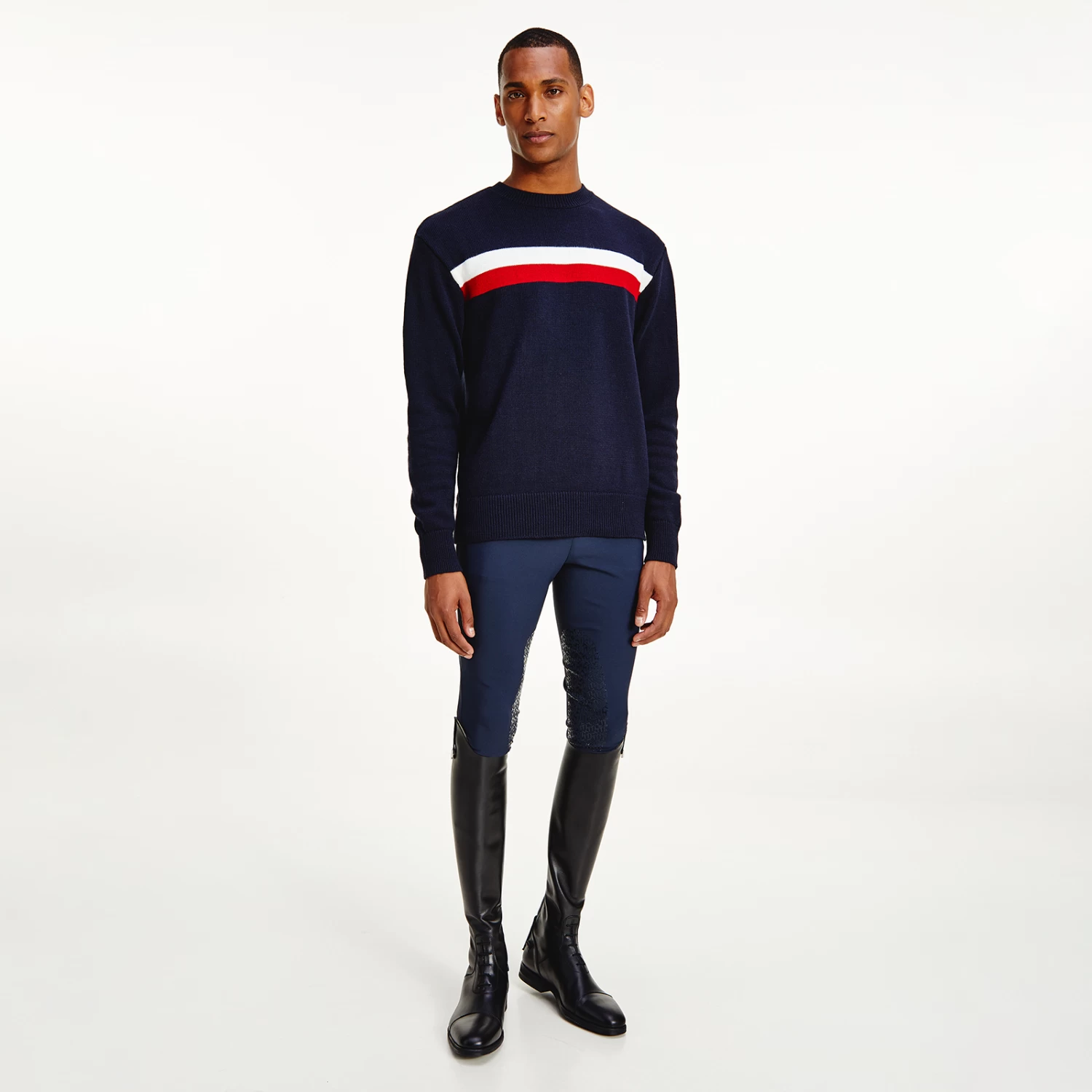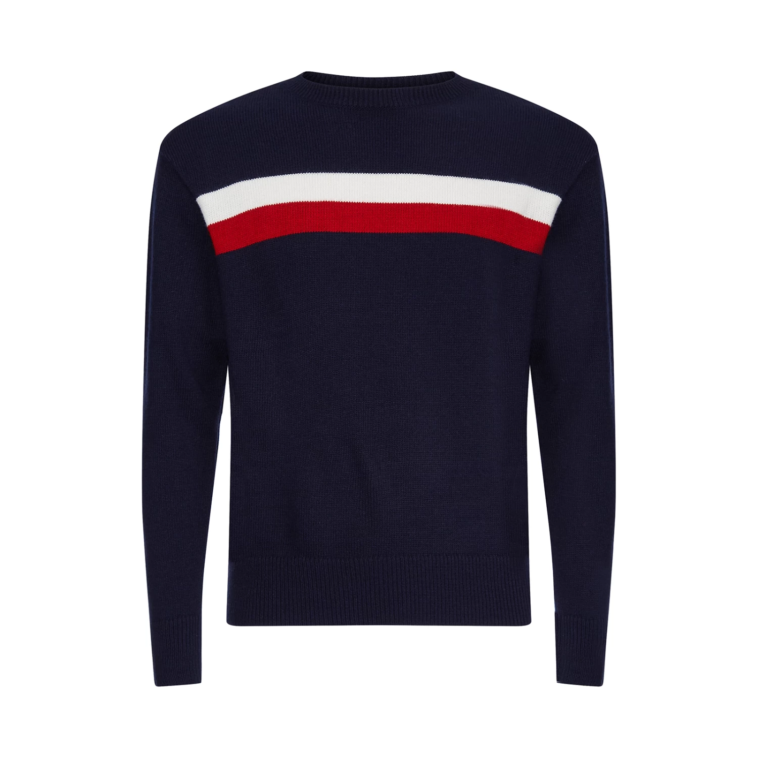Soft winter sweater, made of a polyacrylic-wool blend. Roomy fit with a high collar and colorblock design in the typical Tommy colors at chest-height in the front. Logo badge on left sleeve and TH Global Stripe application at the back of the collar.