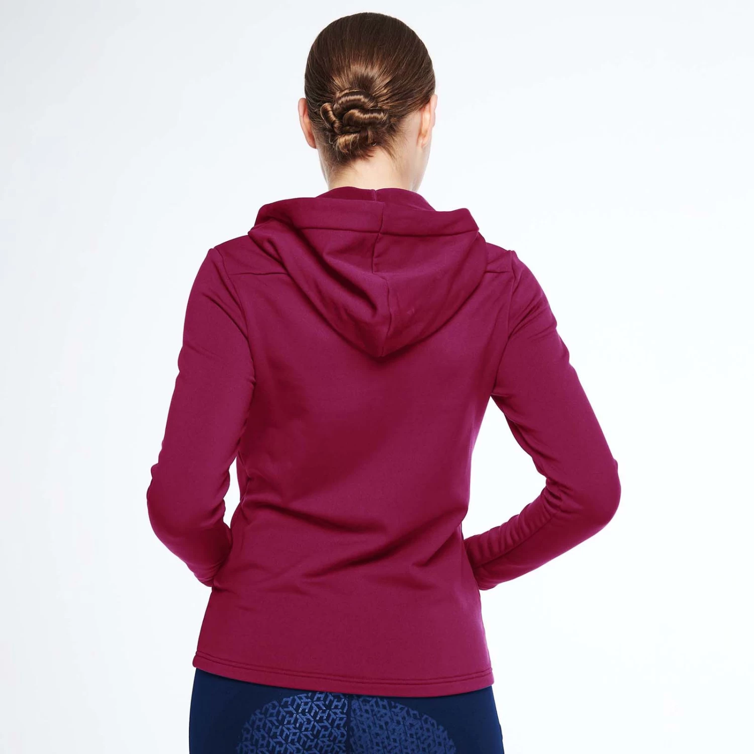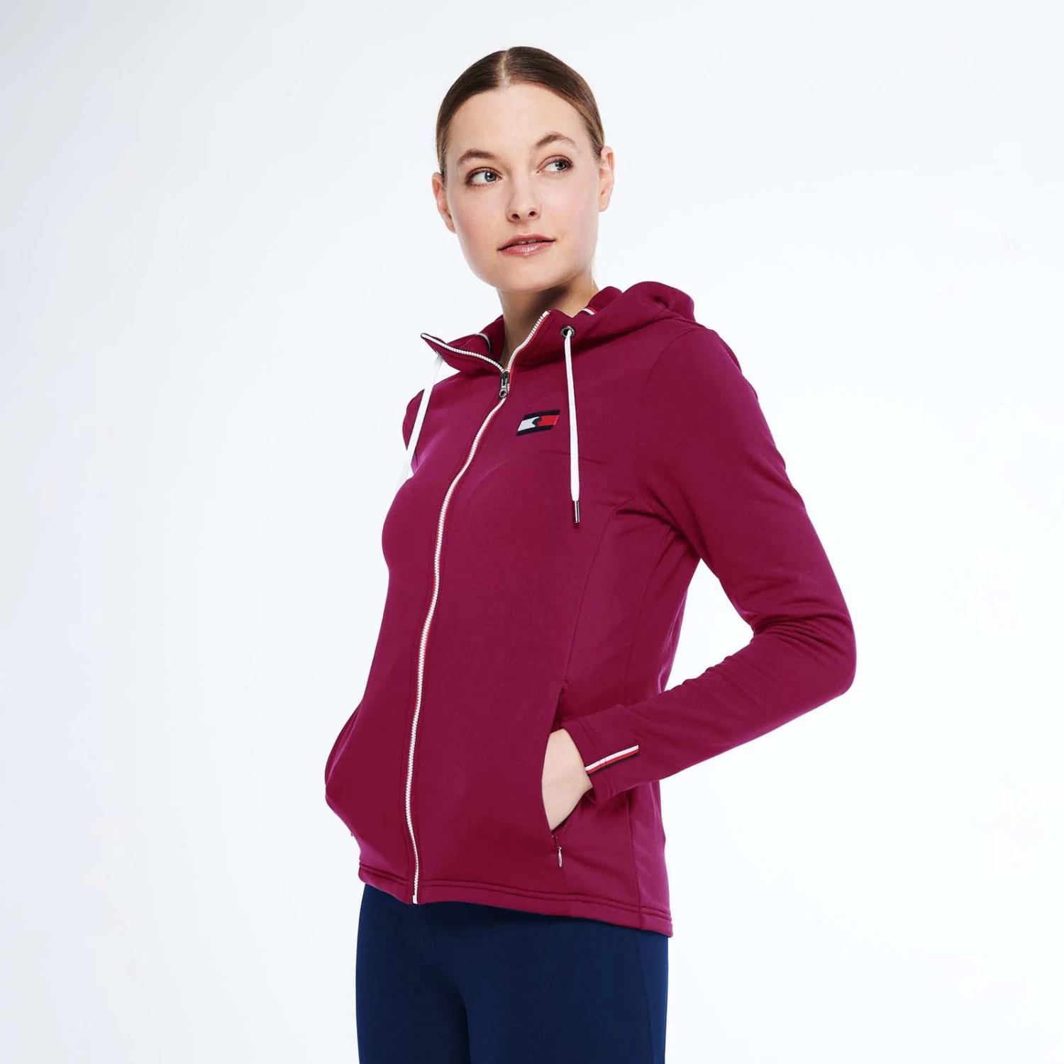 A solid color functional training jacket from Tommy Hilfiger with hidden zippered side pockets, contrast zipper at center front, and a drawstring hood with metal cord ends. The jacket has a TH Global stripe band in the center back, as well as on the inside of the hood.
