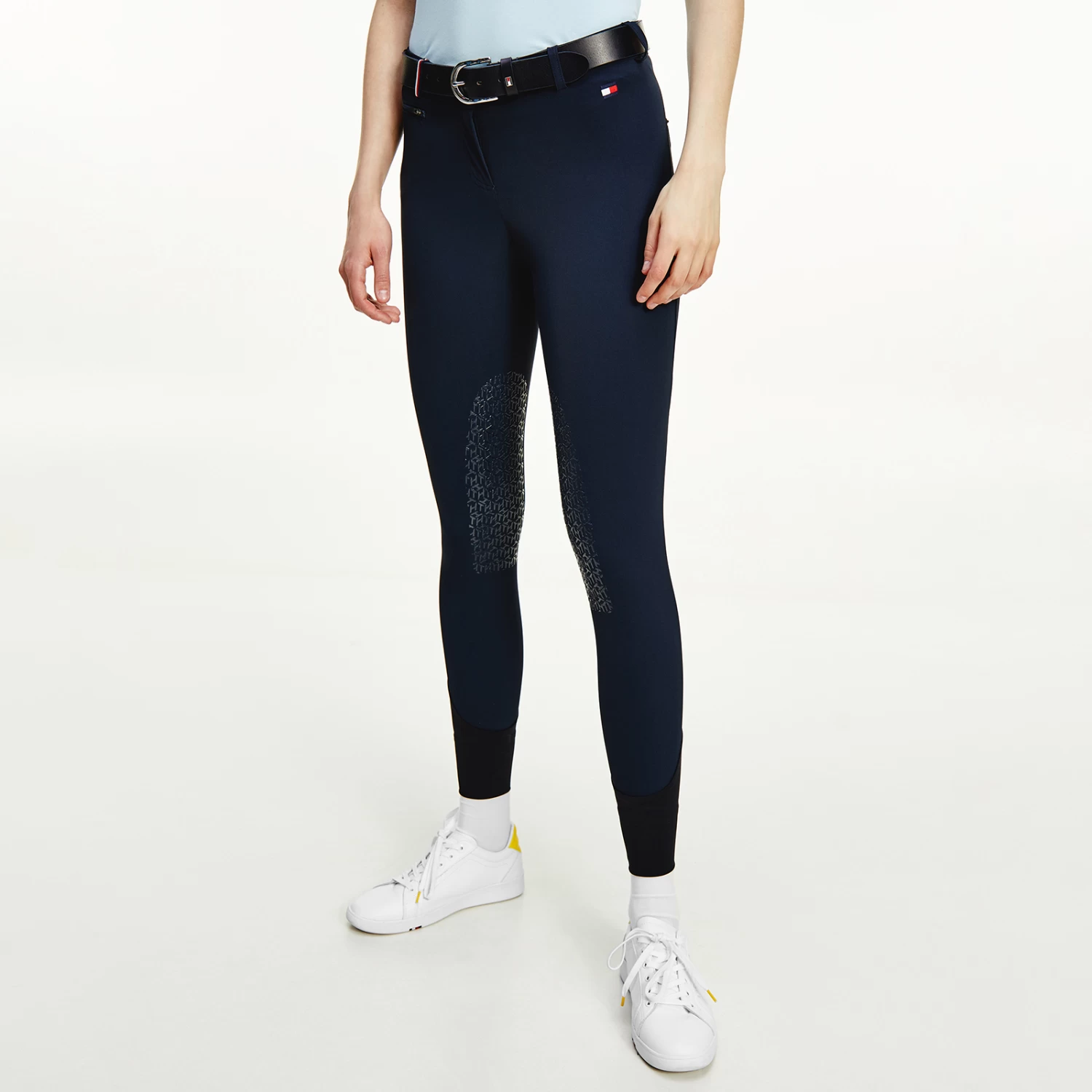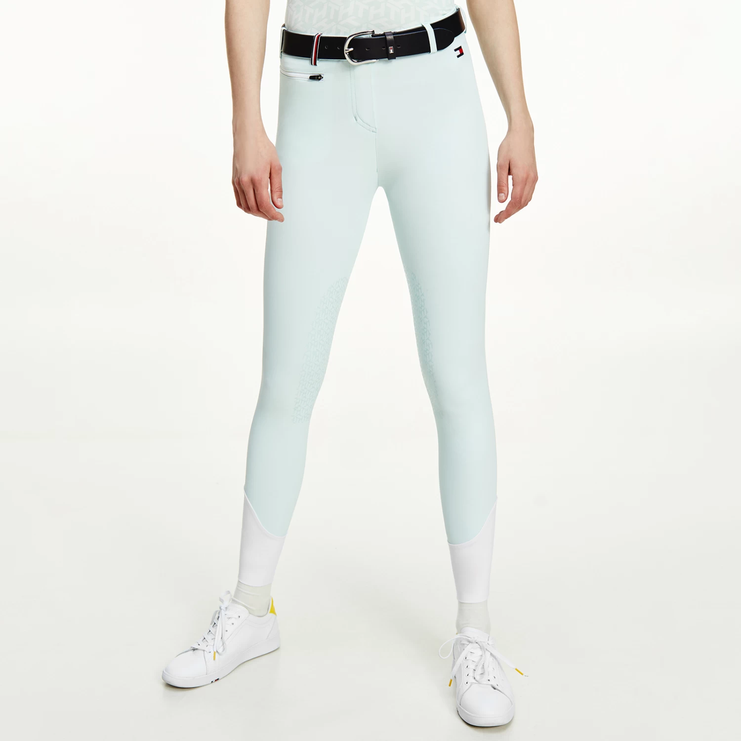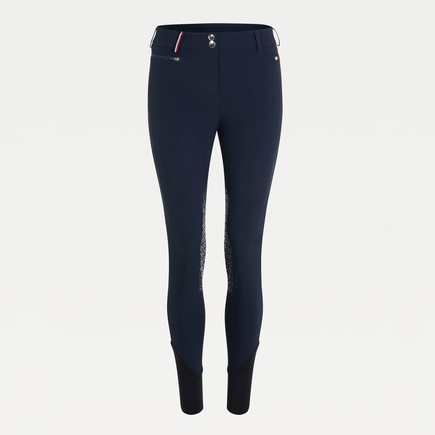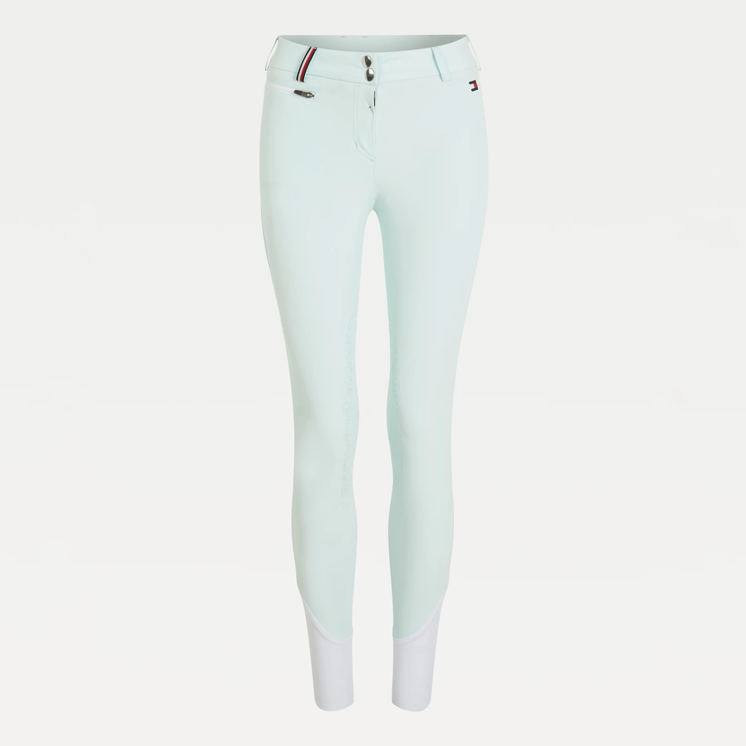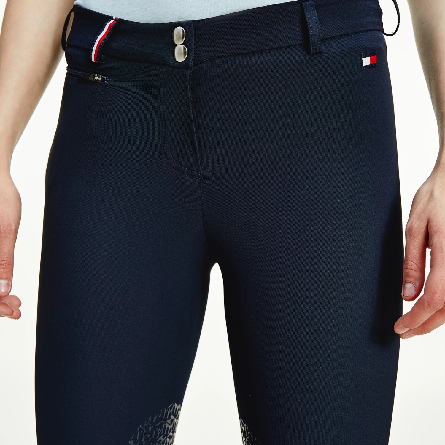 Light summer riding breeches with zipped side pockets and belt loops. Jeans-style back pockets and logo embroidery on the left leg. The belt loops feature the TH Global stripe ribbon. Silicone grip at the knees for perfect hold on the saddle. Bottom yoke made of thin and stretchable fabric for more comfort.
