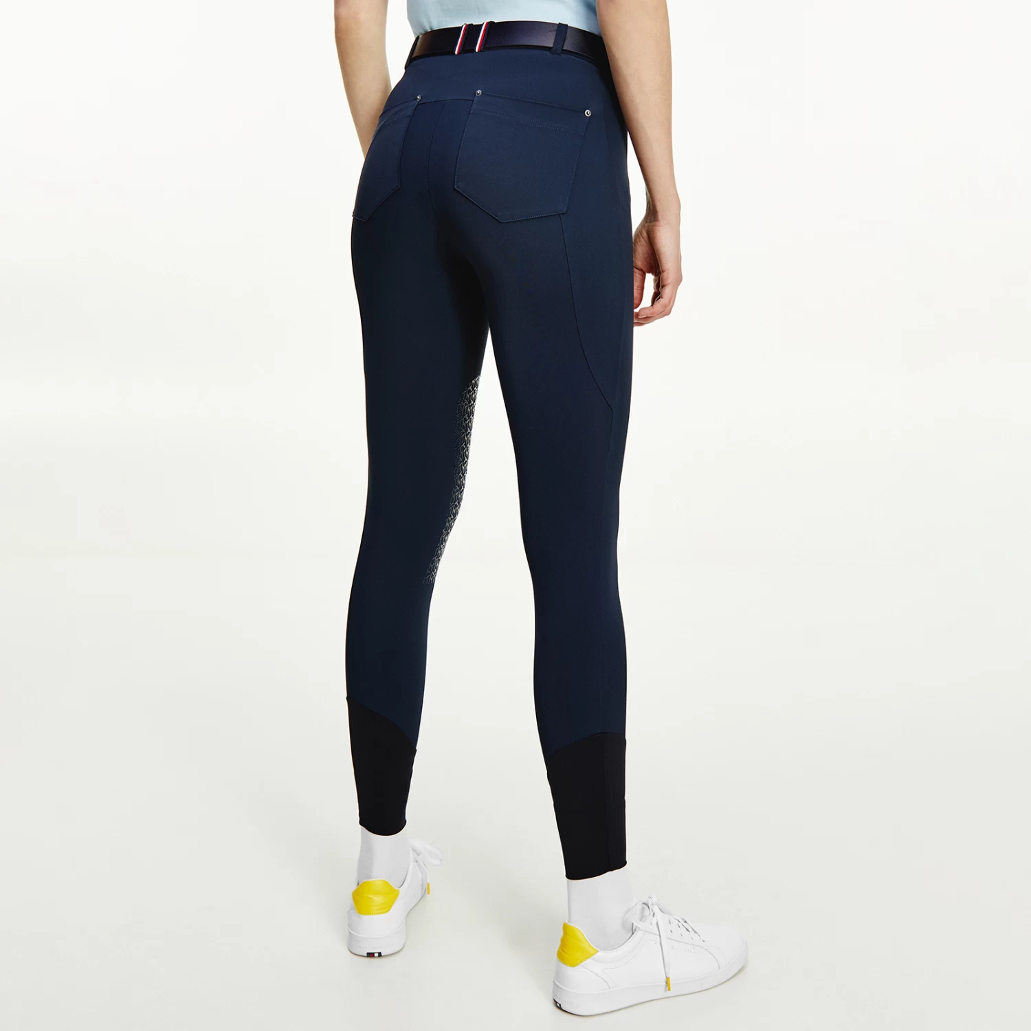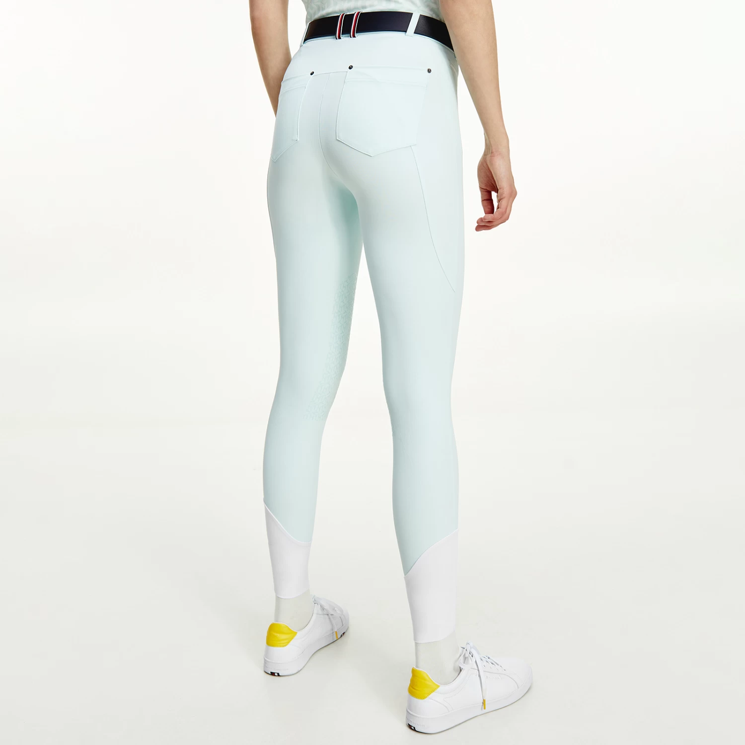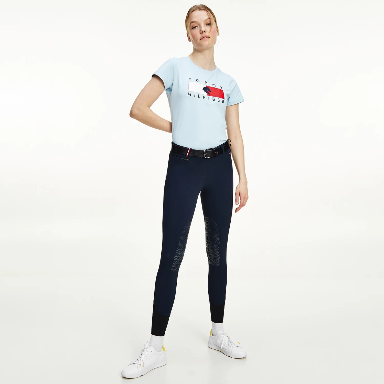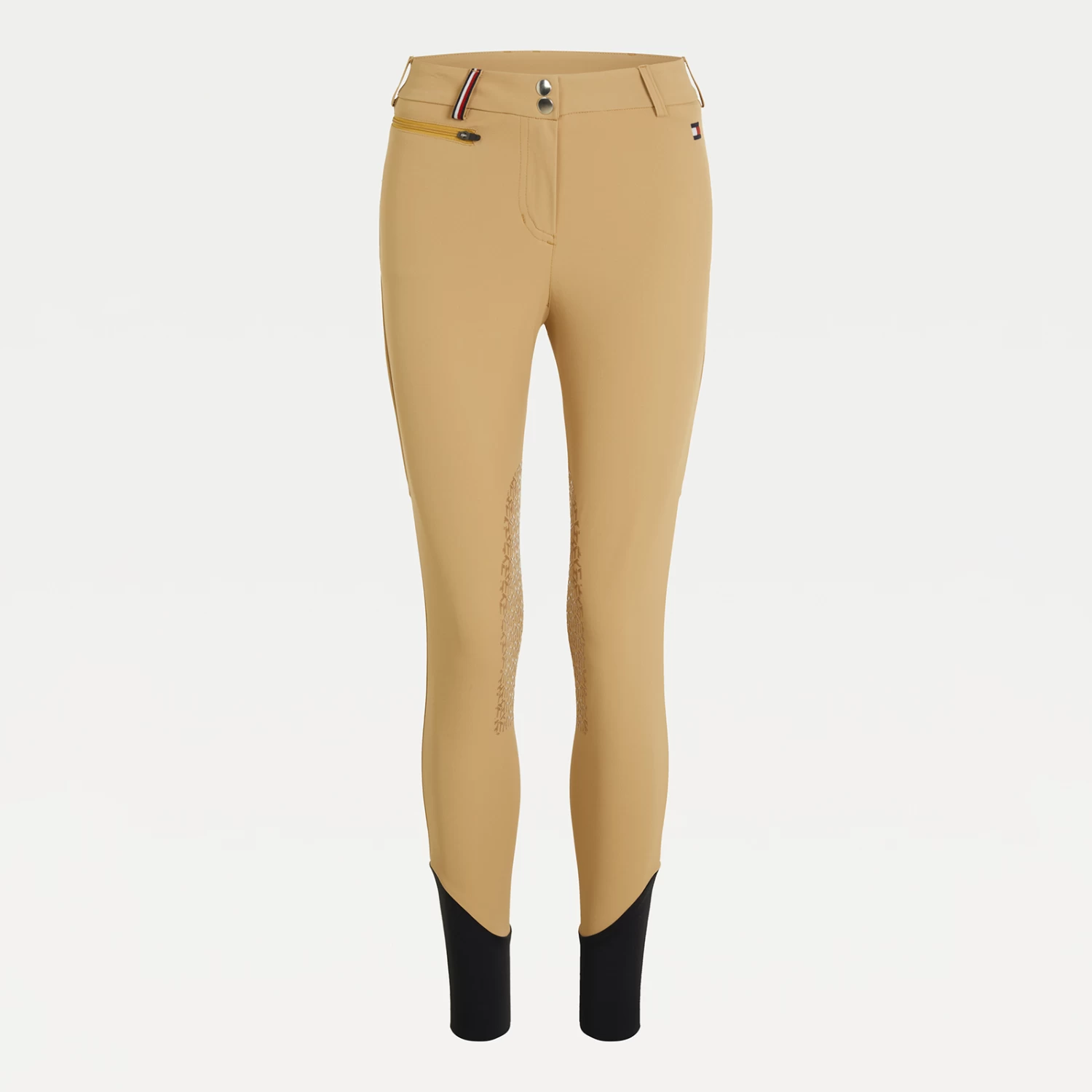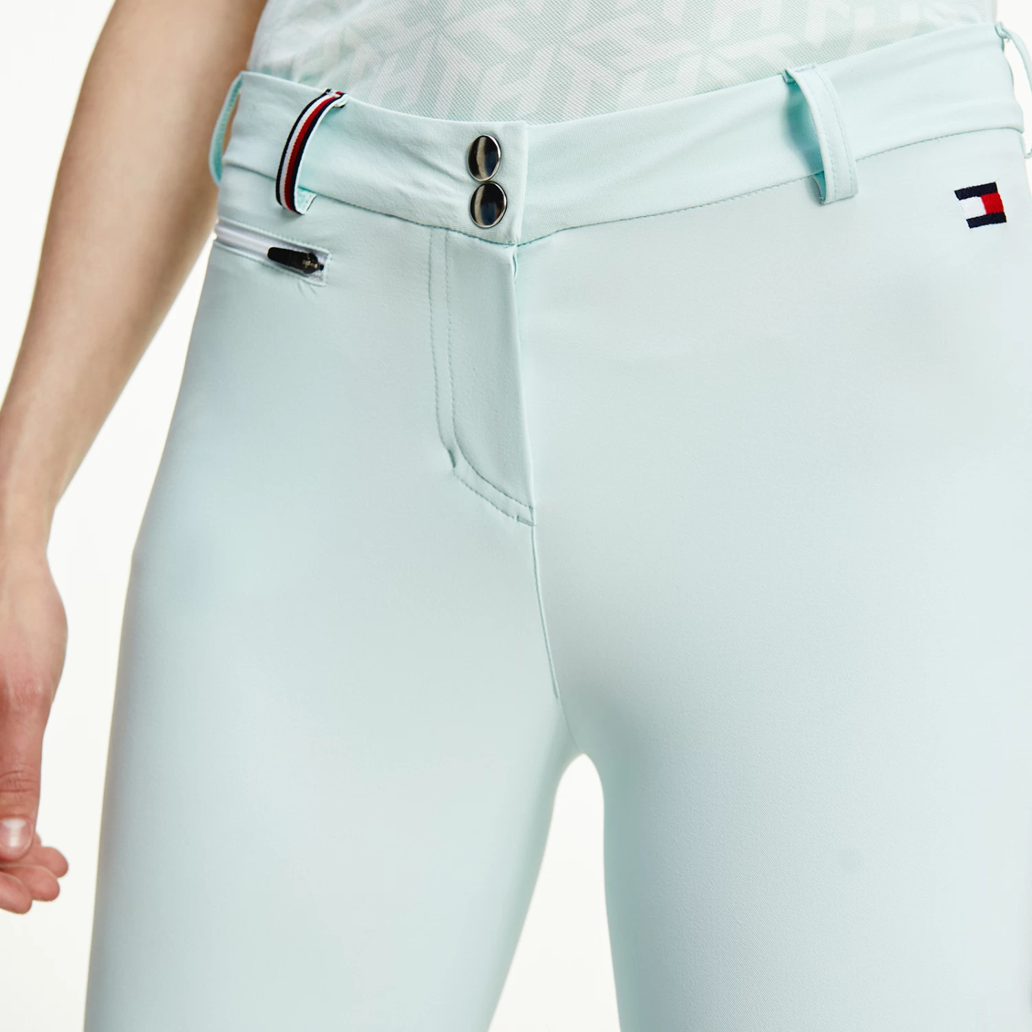 Light summer riding breeches with zipped side pockets and belt loops. Jeans-style back pockets and logo embroidery on the left leg. The belt loops feature the TH Global stripe ribbon. Silicone grip at the knees for perfect hold on the saddle. Bottom yoke made of thin and stretchable fabric for more comfort.